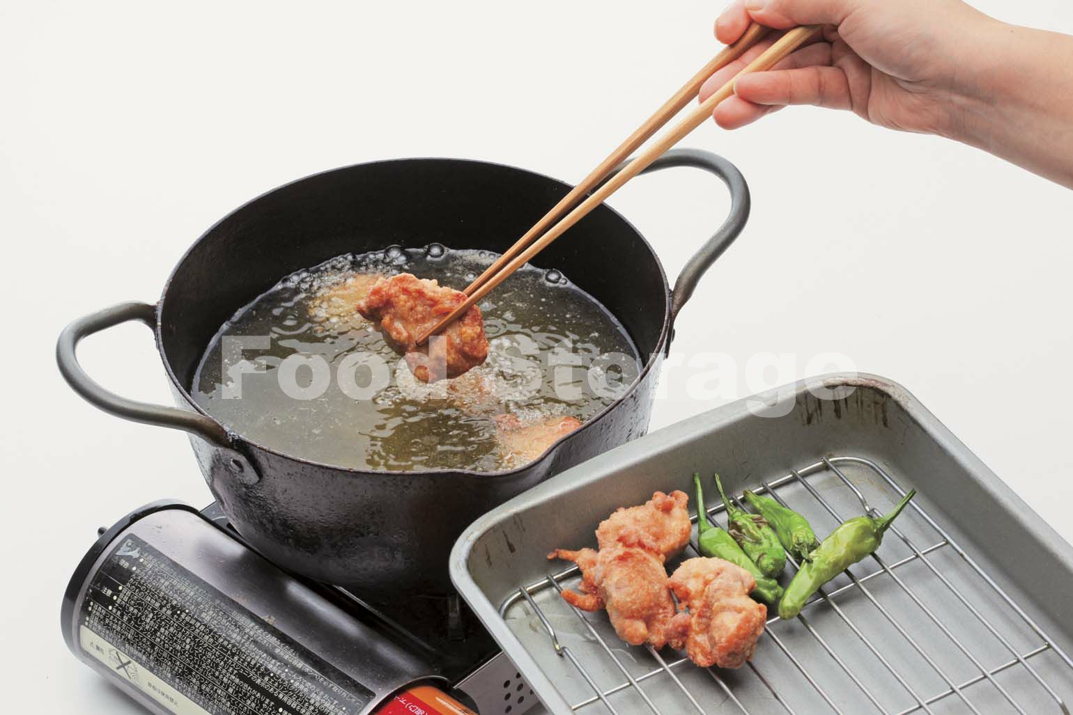 ししとうはつま楊枝などで数か所穴をあける。揚げ油を160℃に熱し、30秒ほど素揚げする。3を1つずつ入れ、くっつかないように菜箸で離しながら揚げ、きつね色になったら一度取り出す。 |