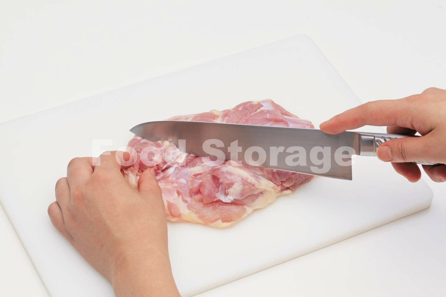 鶏もも肉は皮目を下にしてまな板に置き、2cm間隔で浅い切り込みを入れてすじを切る。さらに半分に切り、塩を両面にふる。 |