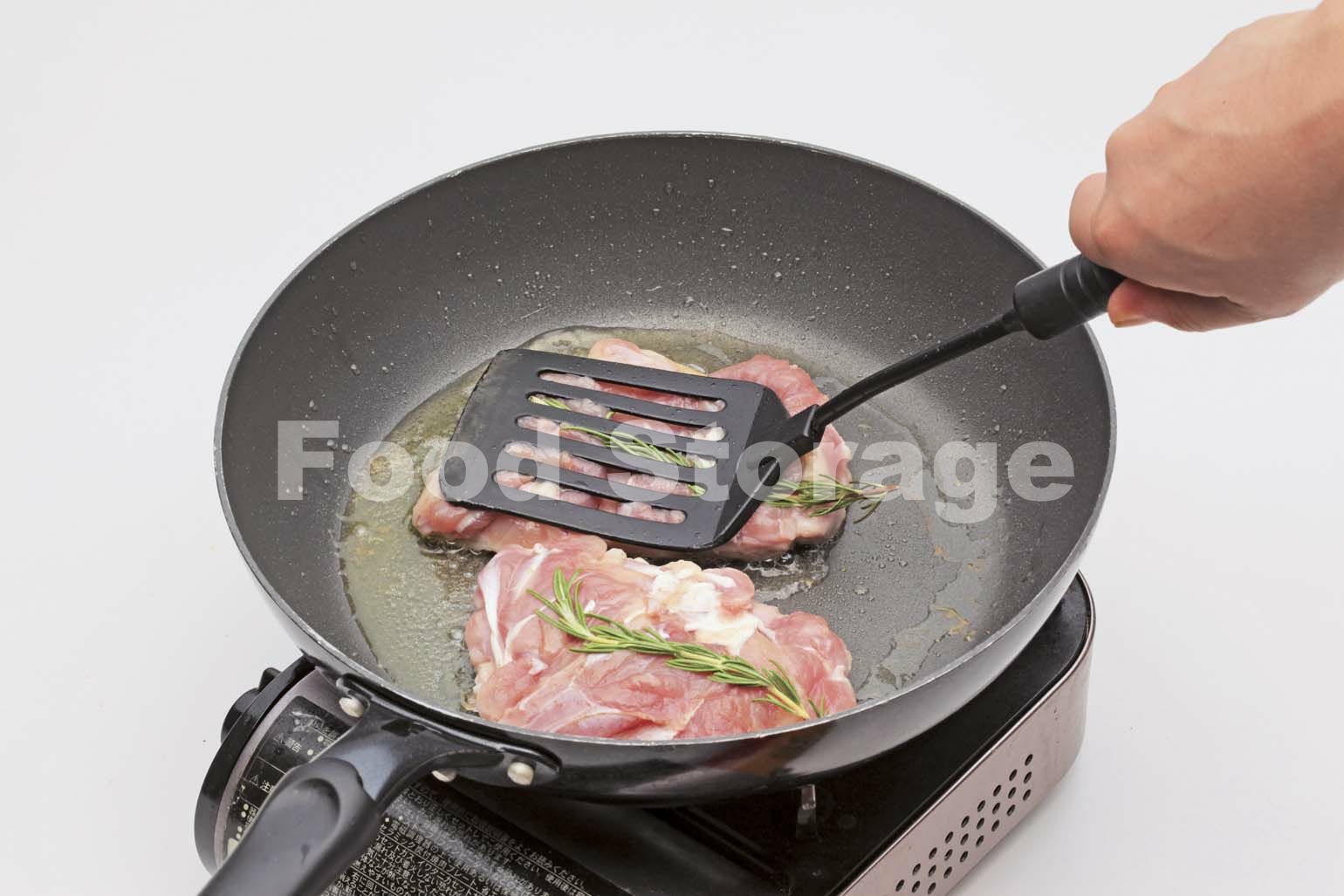 フライパンにオリーブ油を強火で熱し、鶏肉の皮目を下にして並べ、ローズマリーをのせる。 |