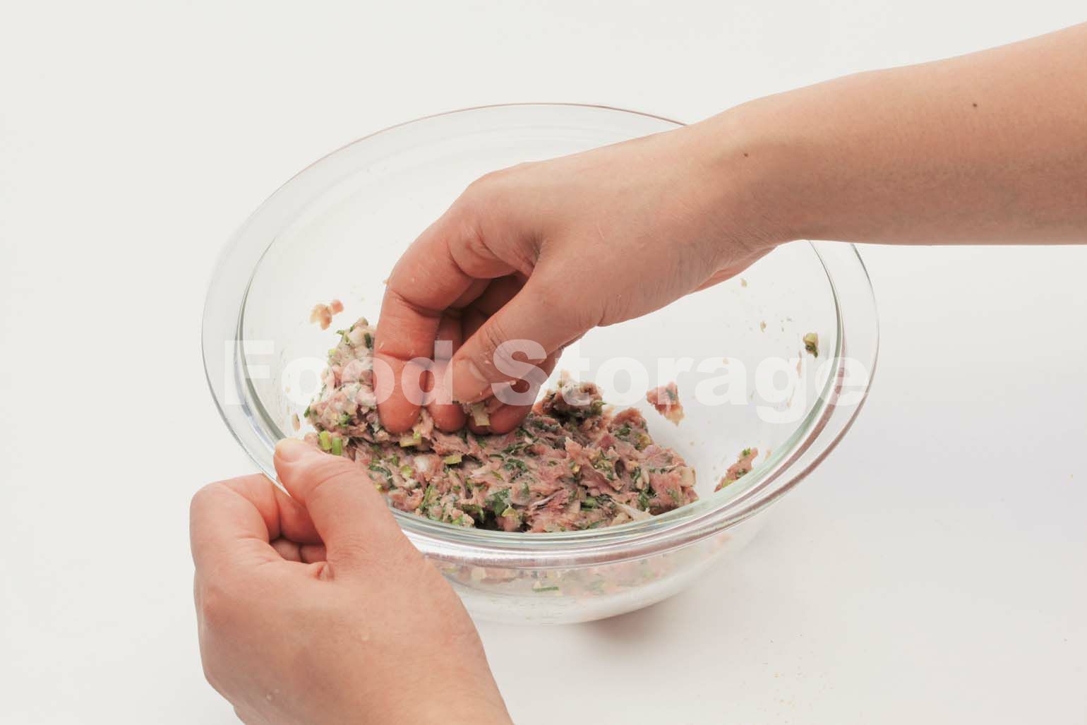 にら、長ねぎは粗みじん切りにし、しょうがはみじん切りにする。ボウルに豚ひき肉を入れ、Aを順に加えて粘りが出るまでよく混ぜる。さらに、にら、長ねぎを加えてよく混ぜる。 |