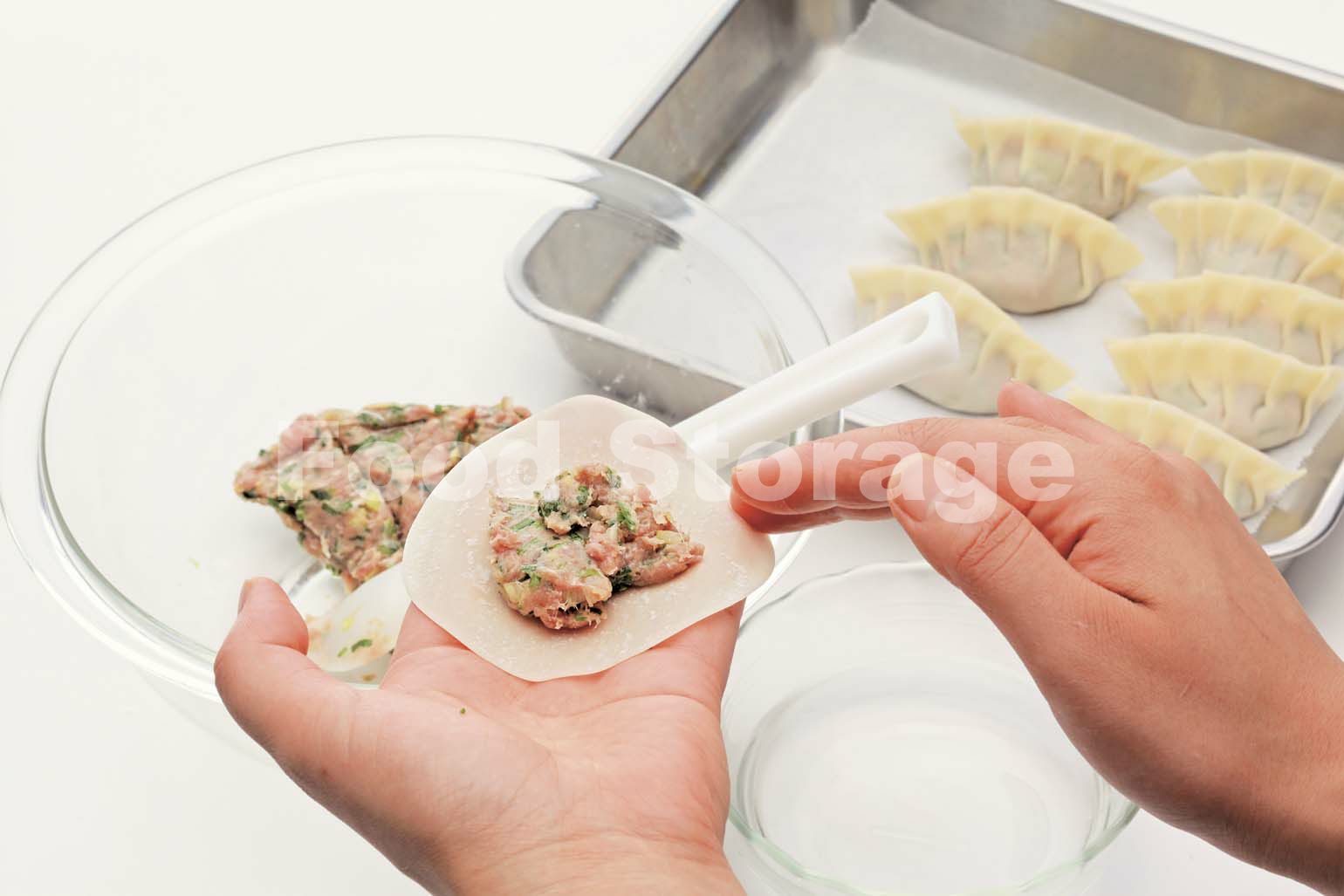 1のたねを12等分にする。ぎょうざの皮の真ん中にたねをのせ、皮のふち上半分に指で水を塗る。 |