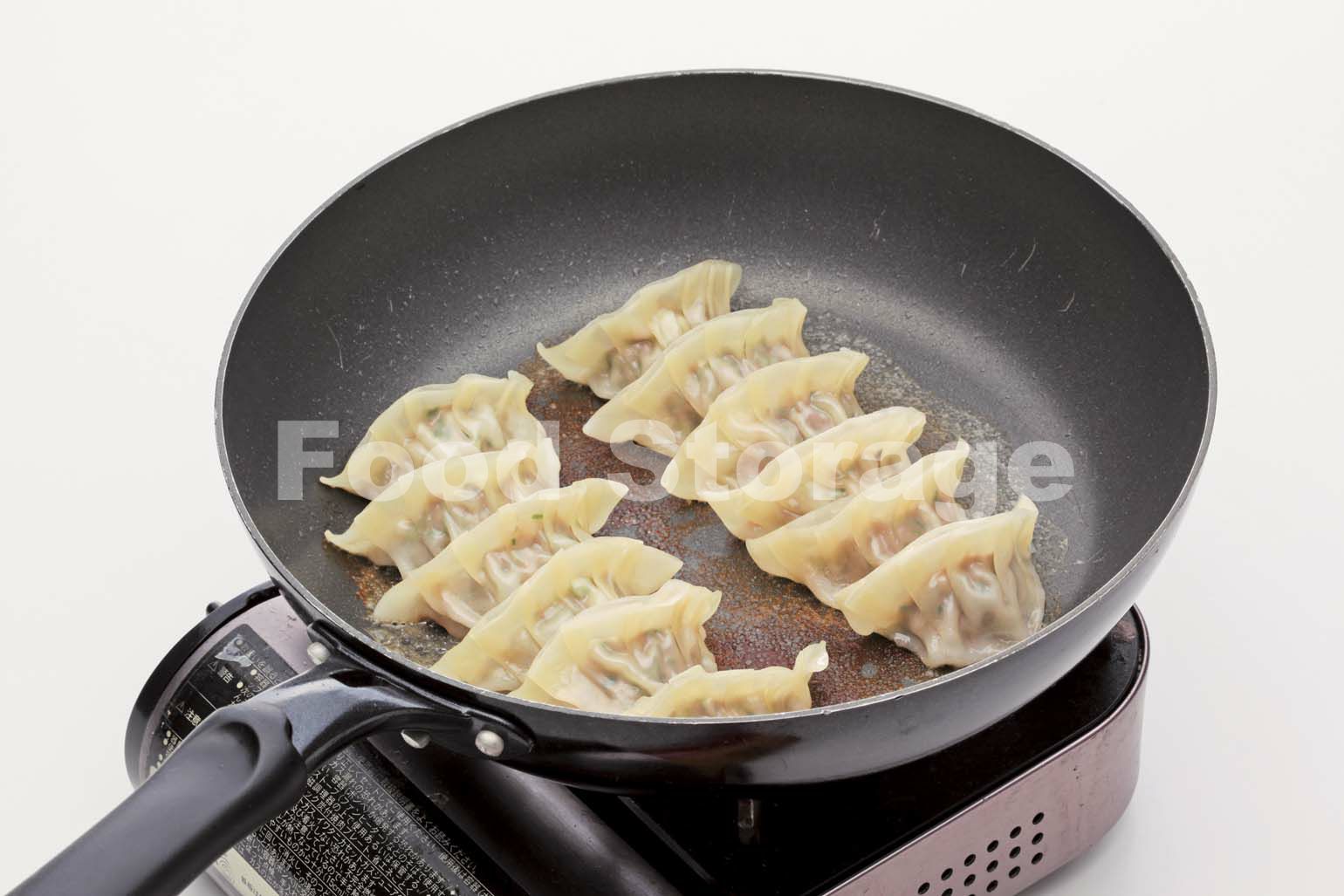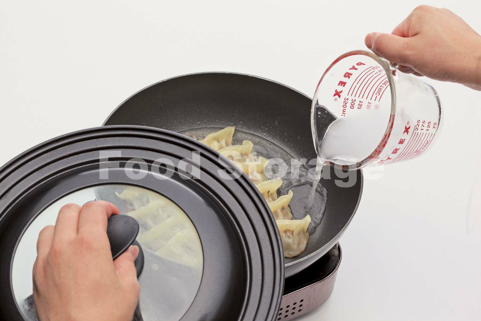 ふたをはずし、ぎょうざのまわりに羽根ができ、水分がほとんどなくなったら強火で水分をとばし、パリッと焼く。好みで酢、しょうゆ、ラー油をつけて食べる。 |