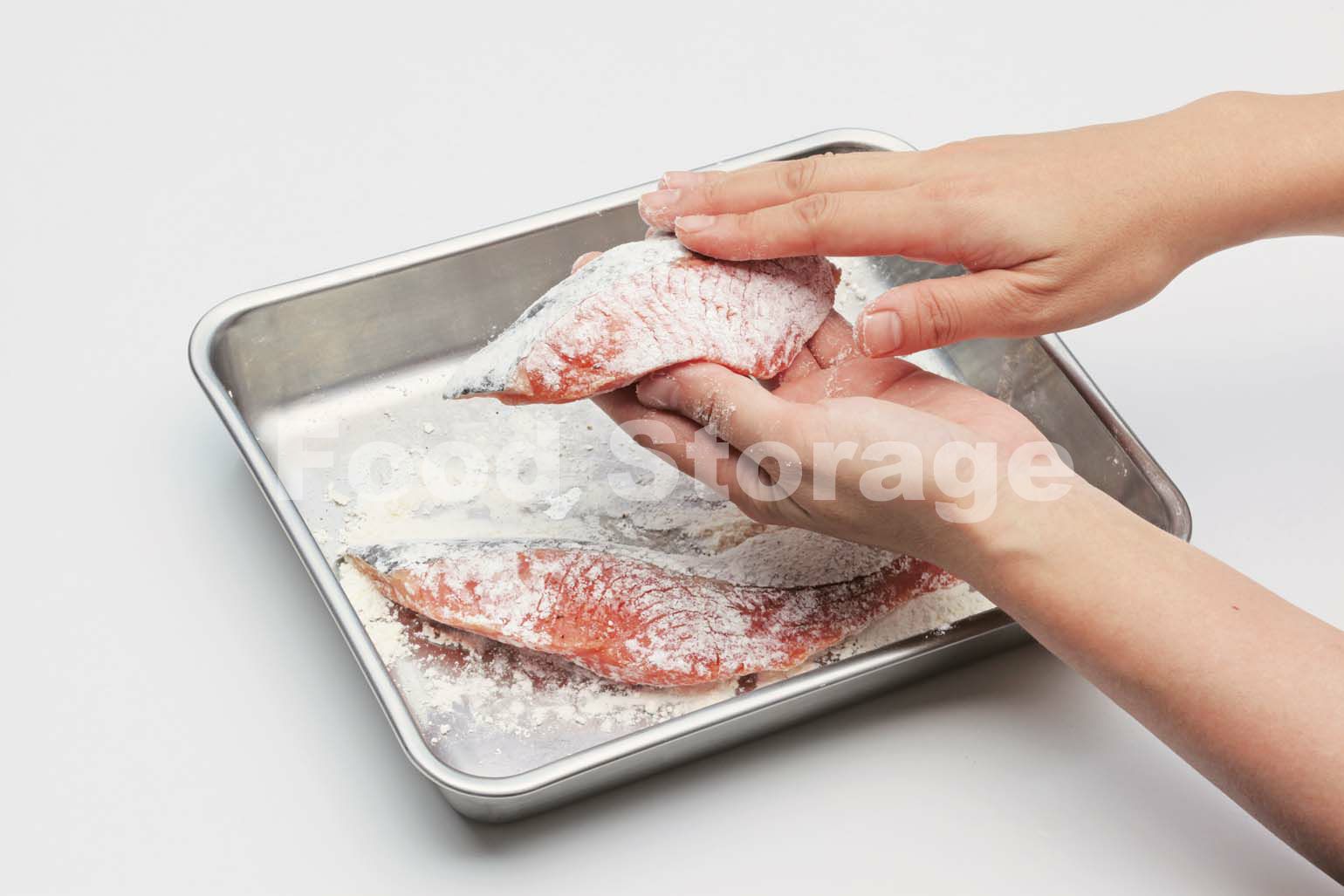 さけの両面に塩、こしょうをふり、小麦粉をまんべんなくまぶし、余分な粉は落とす。 |