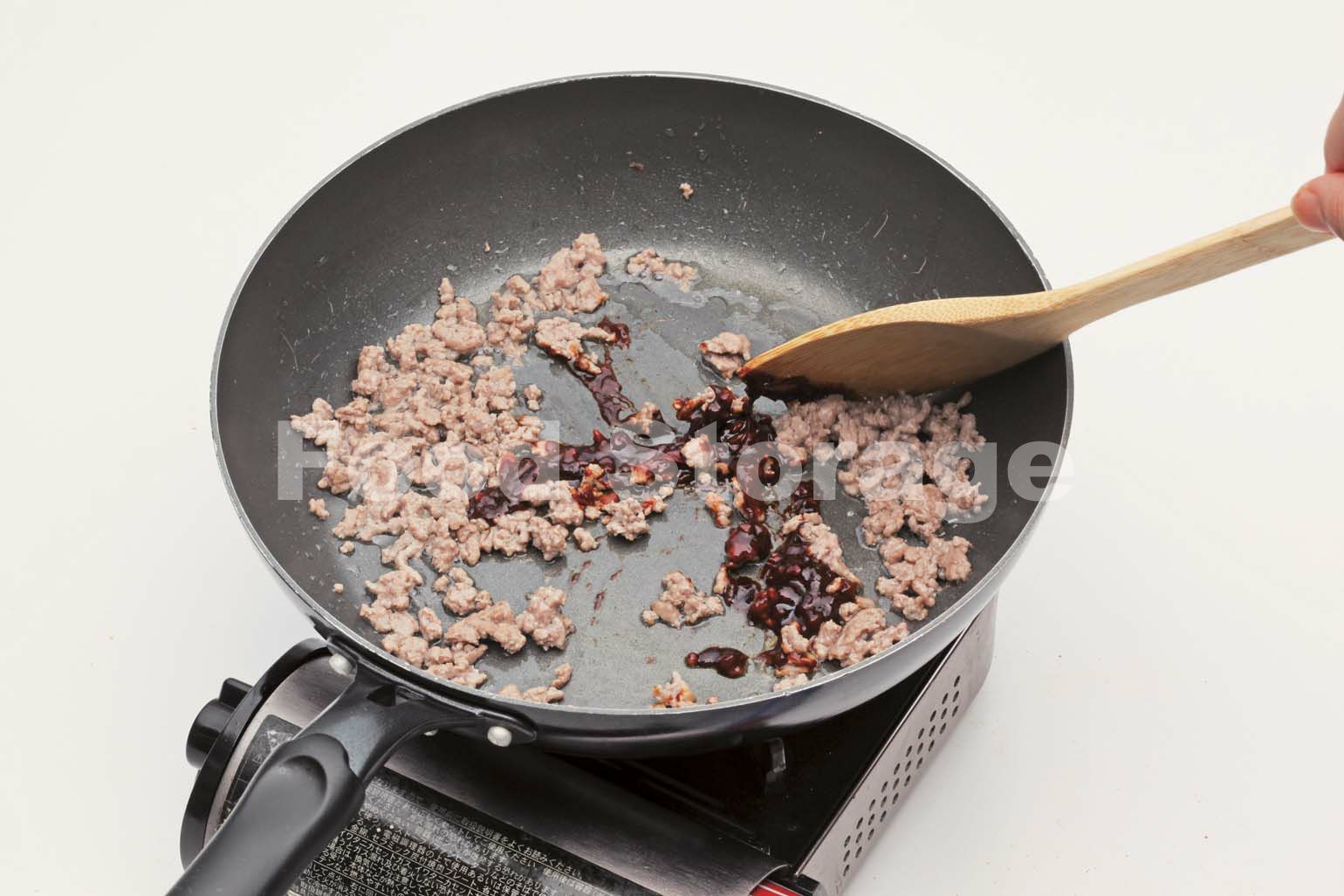 フライパンにサラダ油を強火で熱し、豚ひき肉を入れて炒める。肉がバラバラになり、脂が澄んできたらAを加えて混ぜ、にんにく、しょうが、豆鼓を順に加えて香りが立つまで中火で炒める。 |