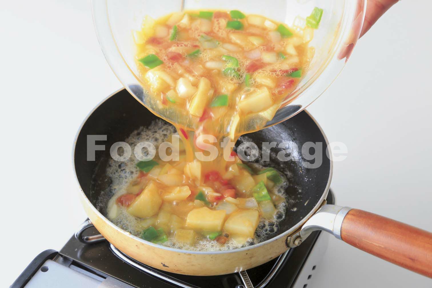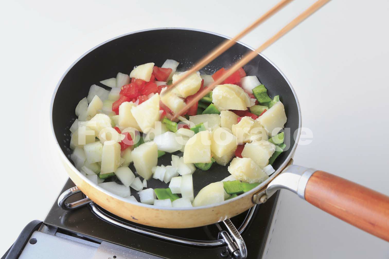 じゃがいもはラップに包み、電子レンジ(600W)で1分30秒加熱し、上下を返してさらに1分加熱する。熱いうちにペーパータオルを使って皮をむき、4つ割りにして8mm厚さに切る。トマトとピーマンはヘタと種を除いて1cm角に、玉ねぎも1cm角に切る。 |