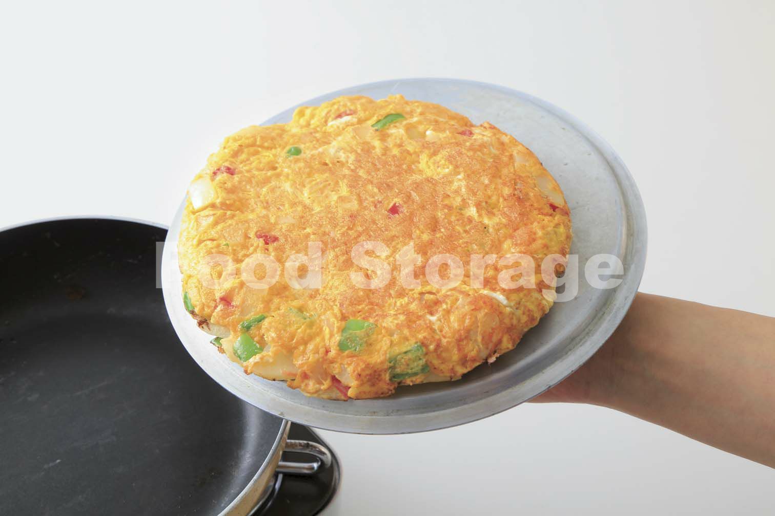 ふちと表面がかたまったら、ふた(または皿)をかぶせてひっくり返してオムレツをのせる。 |