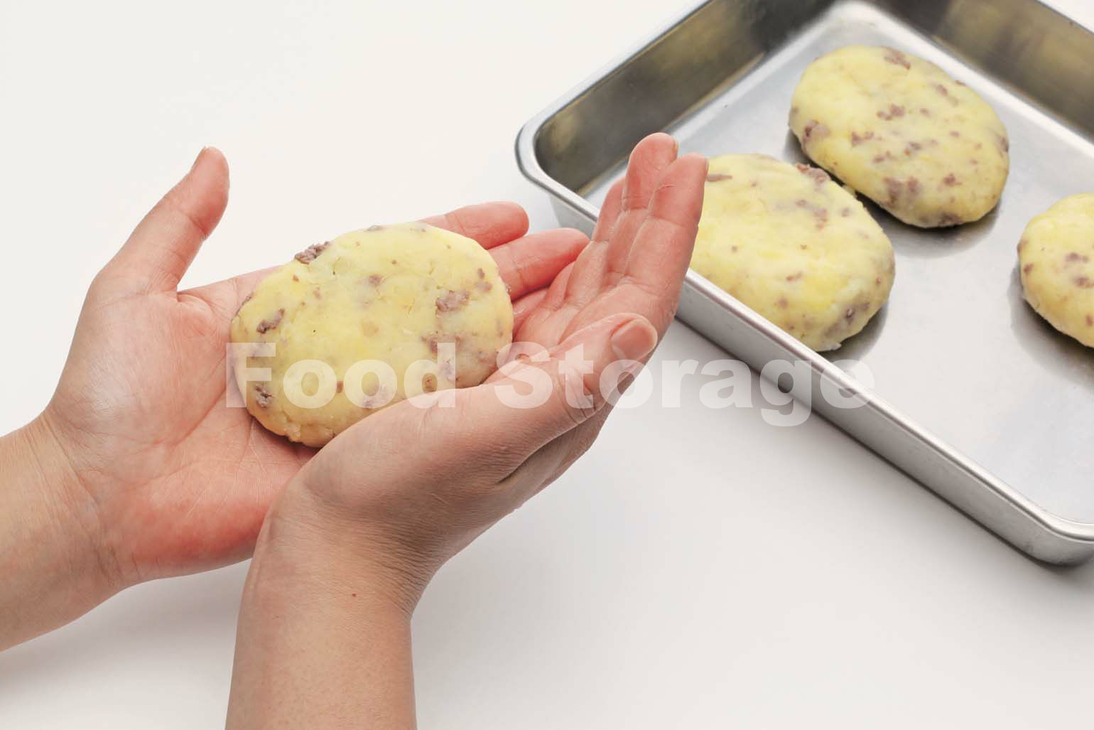 1に2のひき肉を加えてよく混ぜる。あら熱がとれたら4等分にし、両手でキャッチボールをするようにして空気抜きをし、小判型に形を整えて小麦粉をまんべんなくまぶす。 |