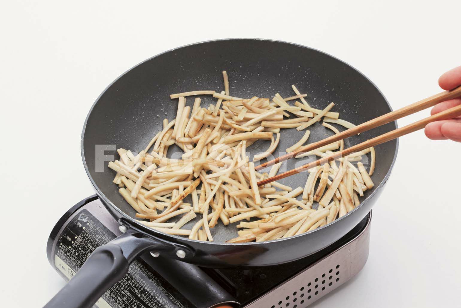 ごぼうは包丁の背で皮をこそぎ、4~5cm長さに切ってから細切りにする。酢少々(分量外)を入れた水煮10分ほどさらしてアクを抜き、洗って水けをきる。 |