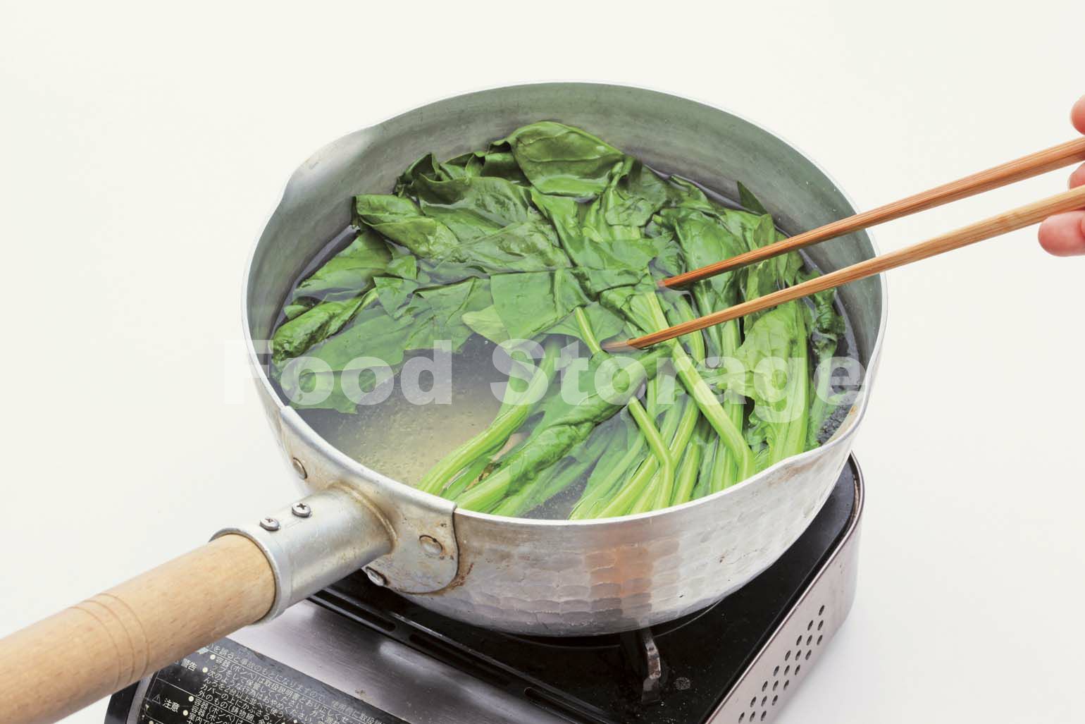 鍋にたっぷりの湯と塩少々(分量外)を加えて沸騰したら、ほうれん草の根のほうから入れてゆでる。 |