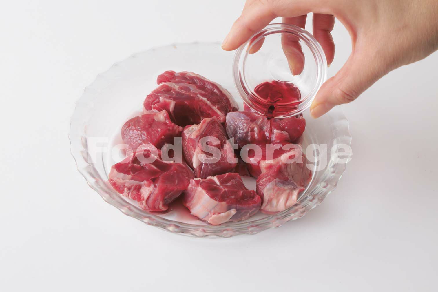 牛肉に赤ワインをふってかるくもんで10分ほどおき、塩、こしょうをふる。 |