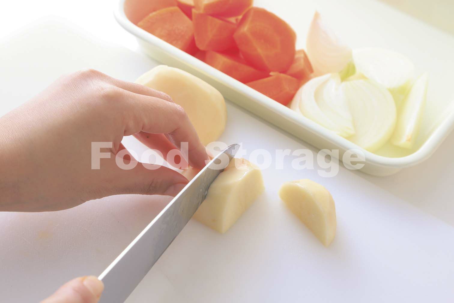 玉ねぎ1個は繊維に直角に薄切りにし、耐熱ボウルに入れてふんわりラップをかけて電子レンジ(600W)で8分加熱する。残りの玉ねぎはくし形切り、にんじんは乱切り、じゃがいもはひと口大に切る。 |