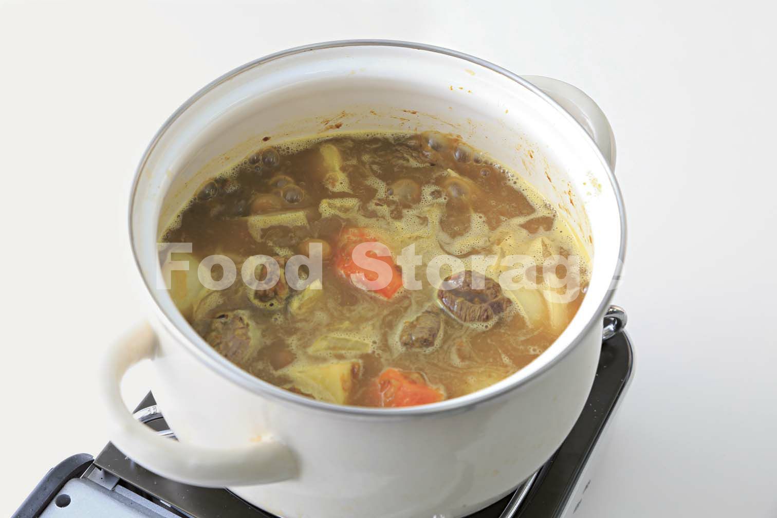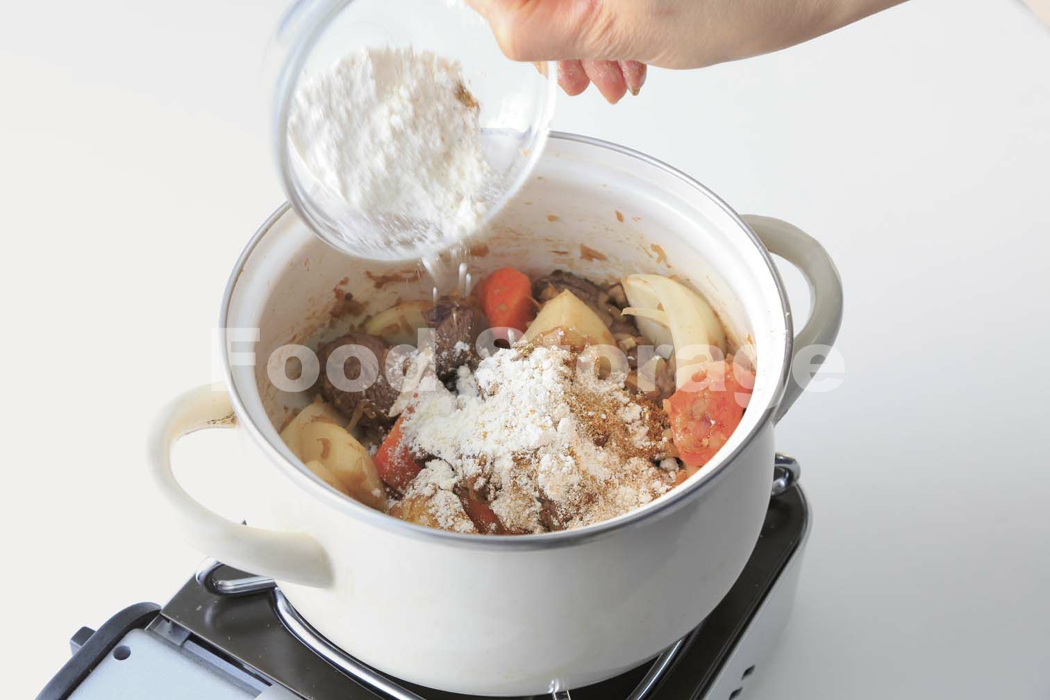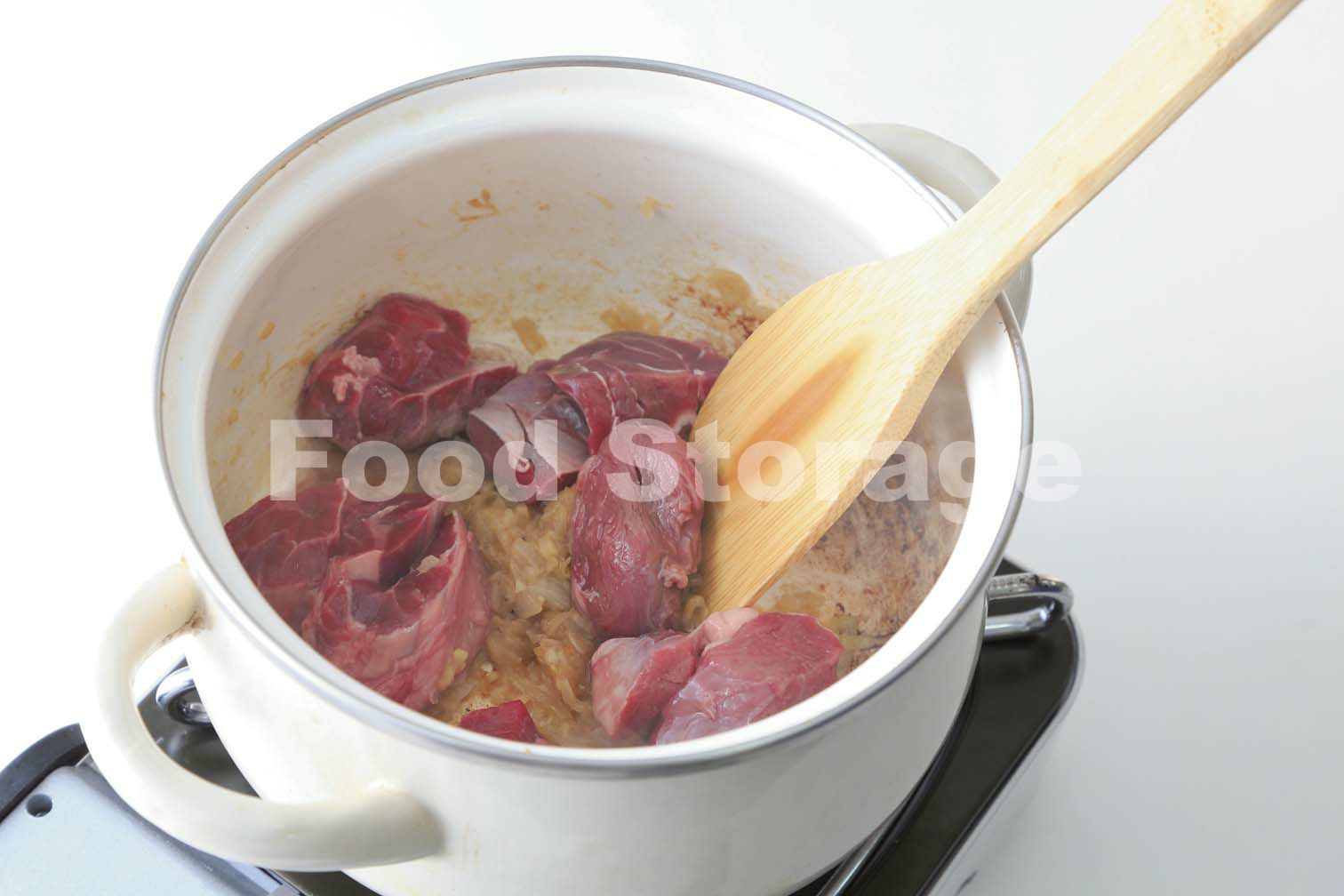 鍋にバターを溶かし、2の加熱した玉ねぎを中弱火で炒め、サラダ油を加えてにんにく、しょうがを入れて炒める。1の牛肉を加えてさらに炒め、肉の色が変わったら残りの玉ねぎ、にんじん、じゃがいもを加えて炒める。 |
