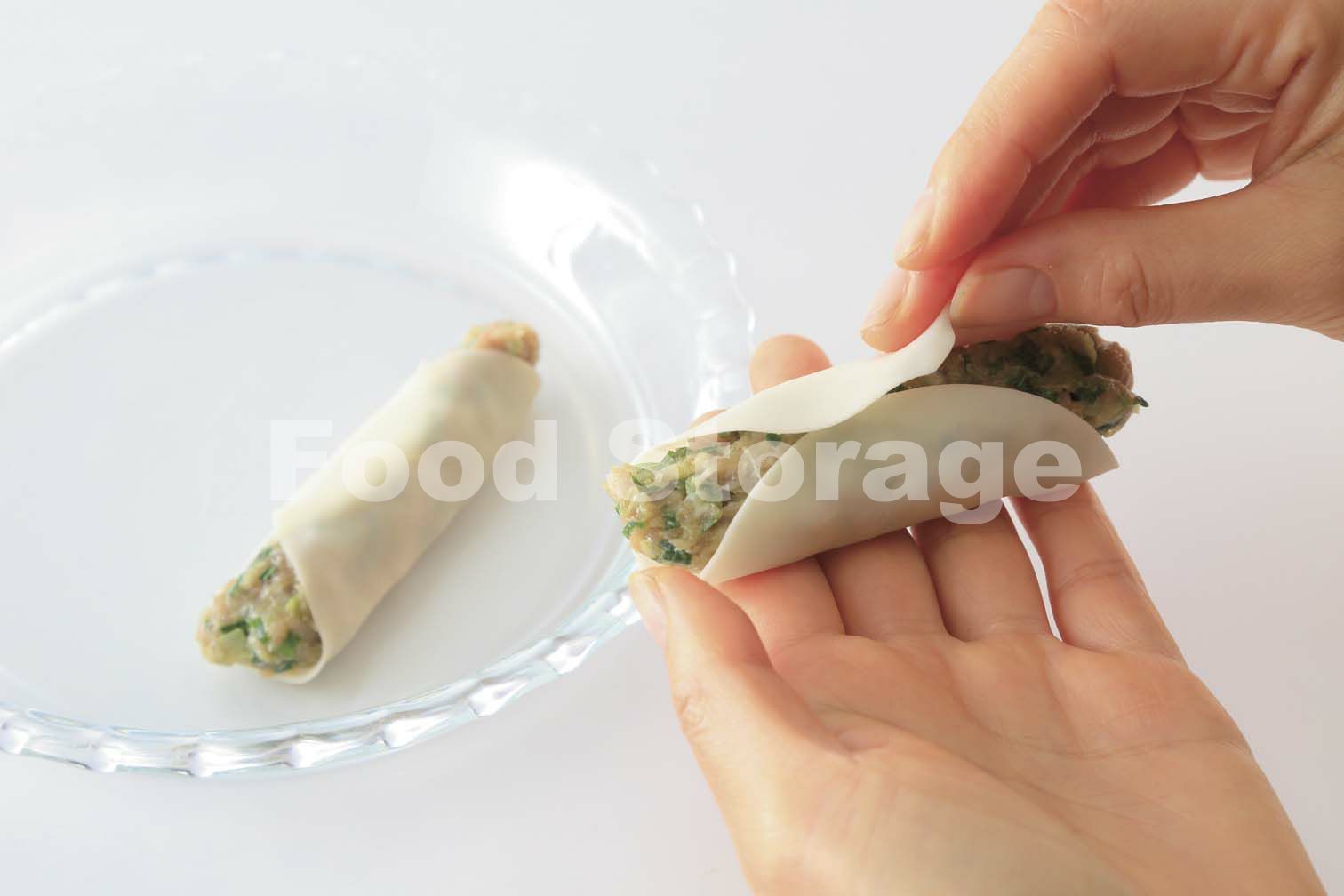 1を6等分にし、ぎょうざの皮に棒状にのせる。皮のふちの片側に水を塗り、くっつける。 |
