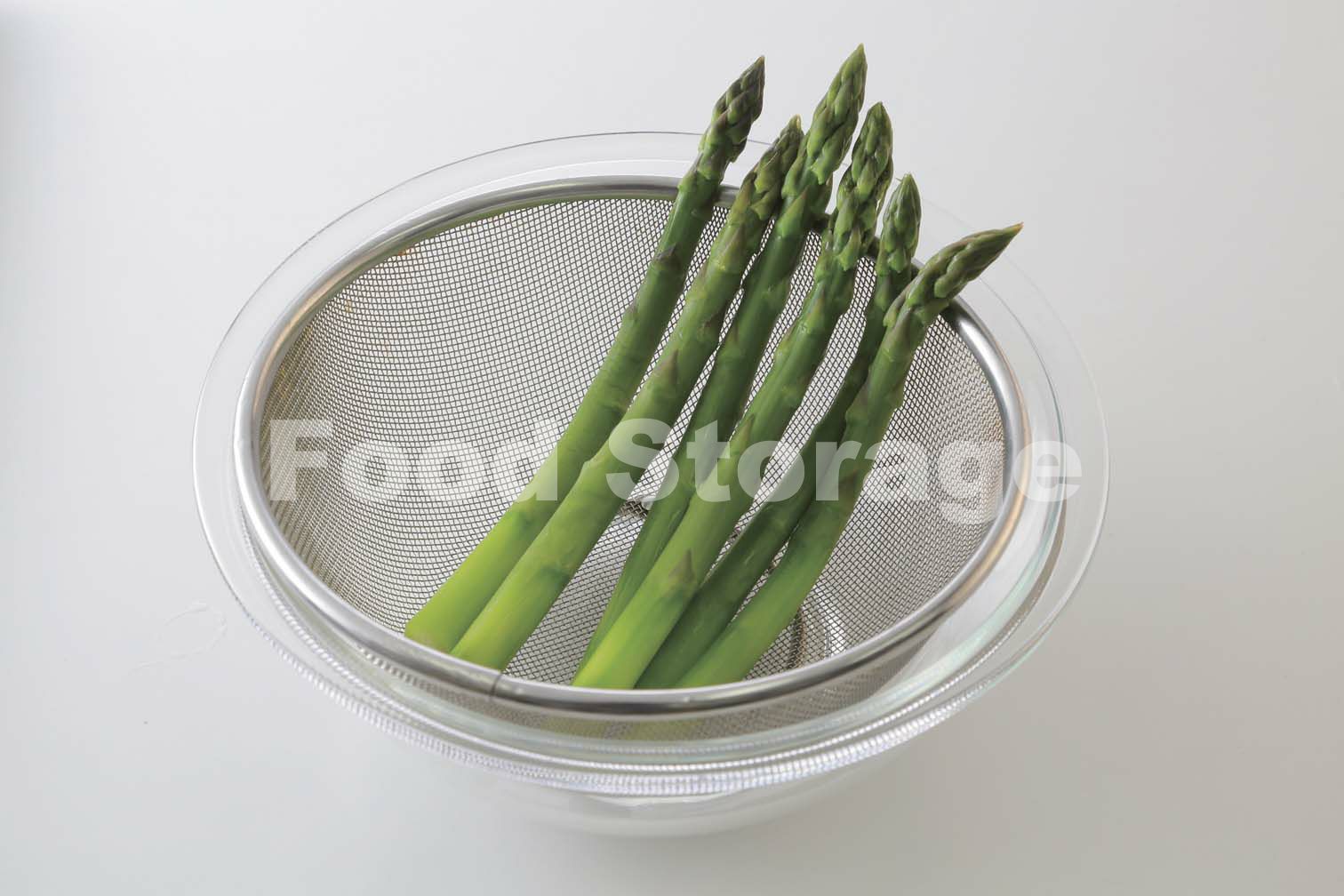 グリーンアスパラガスは根元をピーラーでむき、塩少々(分量外)を加えた熱湯で40秒ほどゆで、ざるにあげて冷ます(太いものは長めに)。