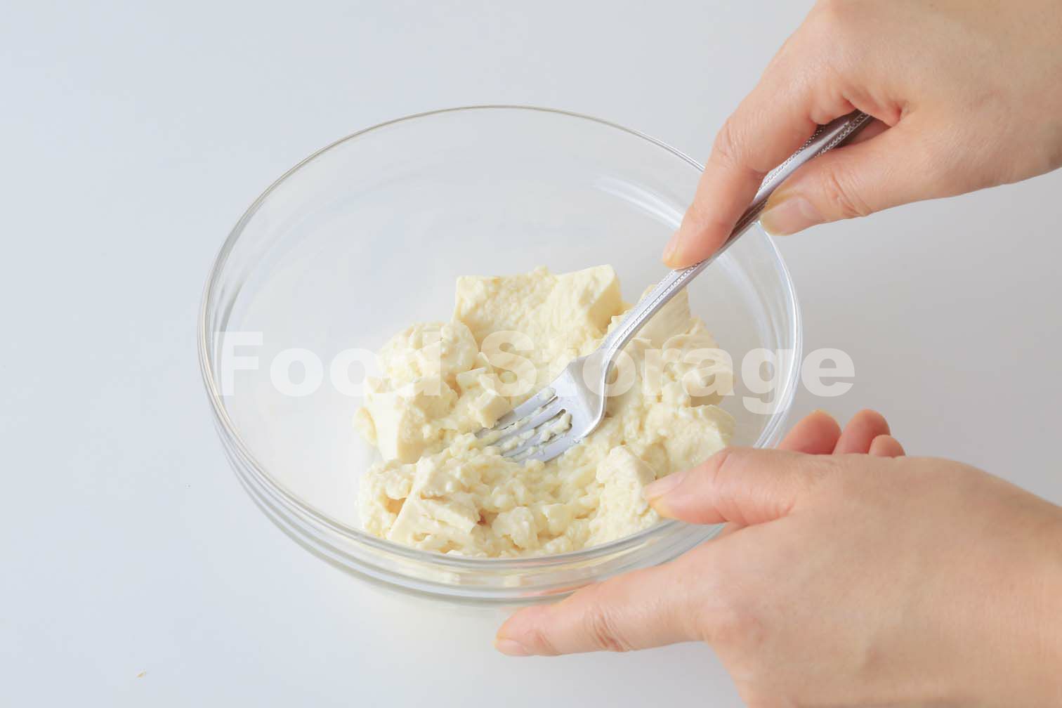 豆腐はフォークでかき混ぜるようにしてつぶす。つぶすことで、クラッカーにのせて食べるなど使い方も広がる。