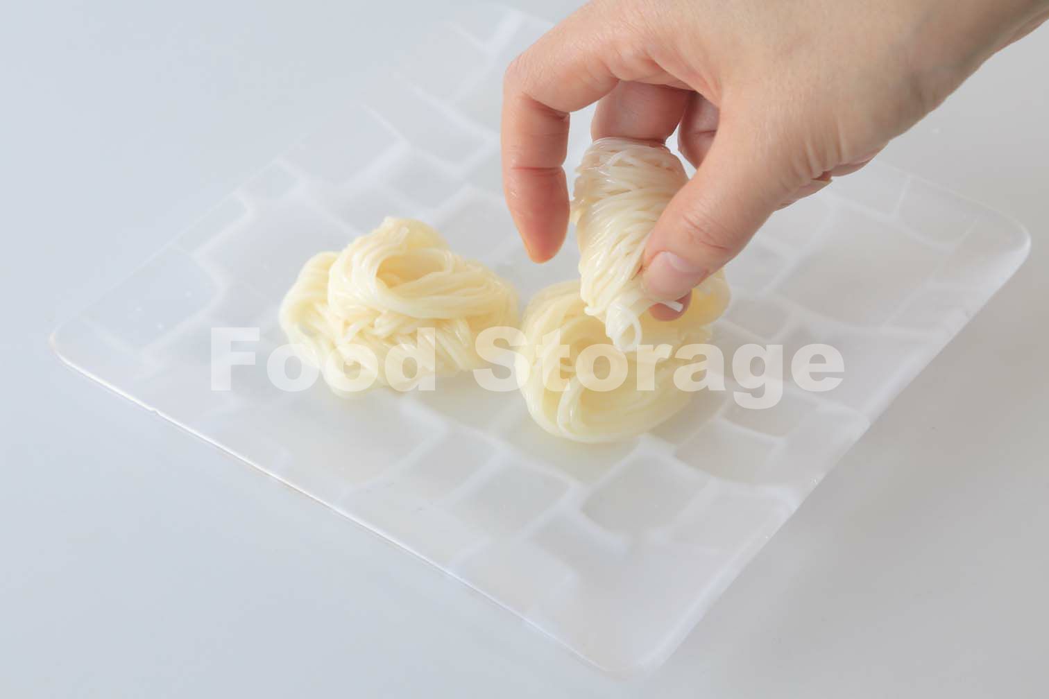 そうめんのひとつかみ取って指にくるくると巻きつけて盛る。