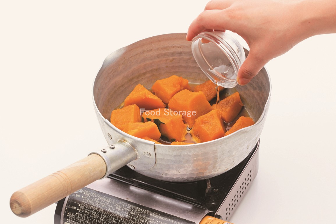 鍋にかぼちゃの皮を下にして重ならないように入れ、だし汁、砂糖、しょうゆを入れて強火にかける。 |