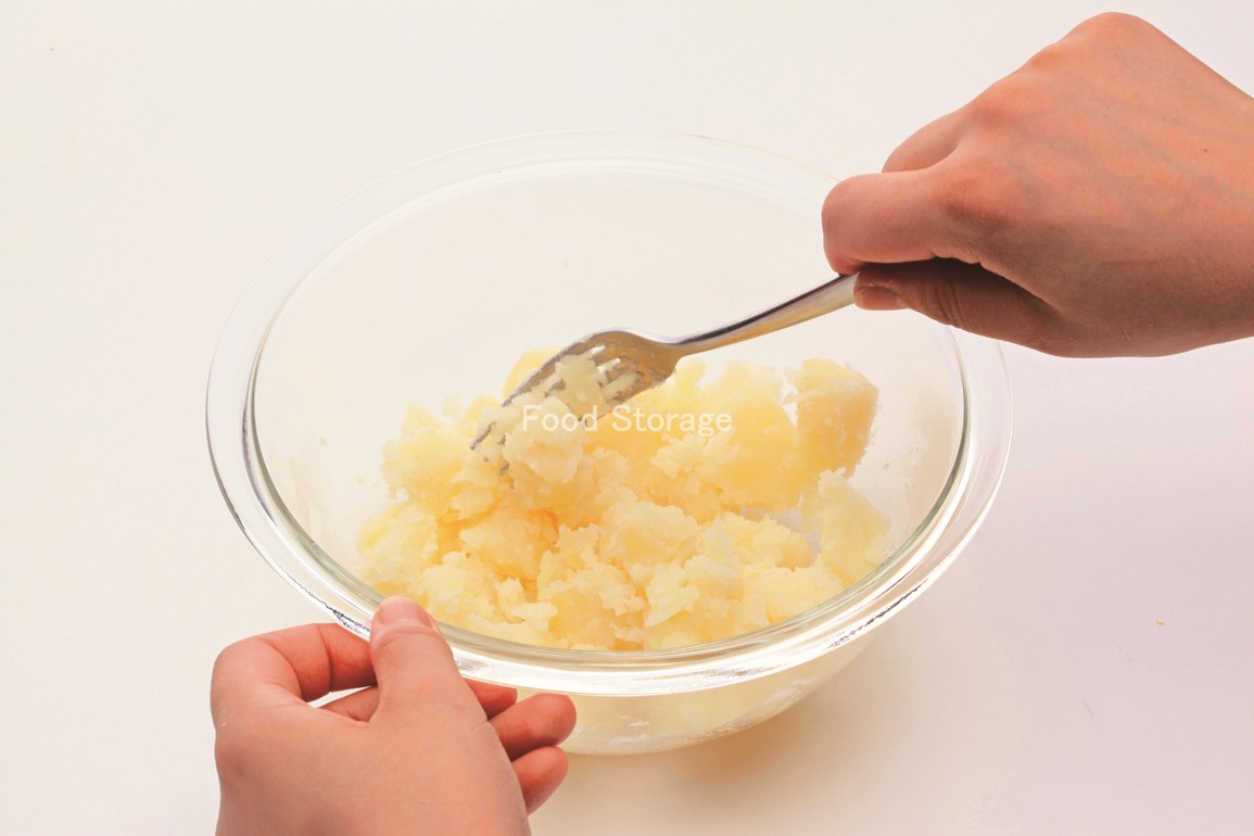 じゃがいもは冷めるとかたくなり、つぶしにくくなるため、熱いうちにフォークでつぶす。 |