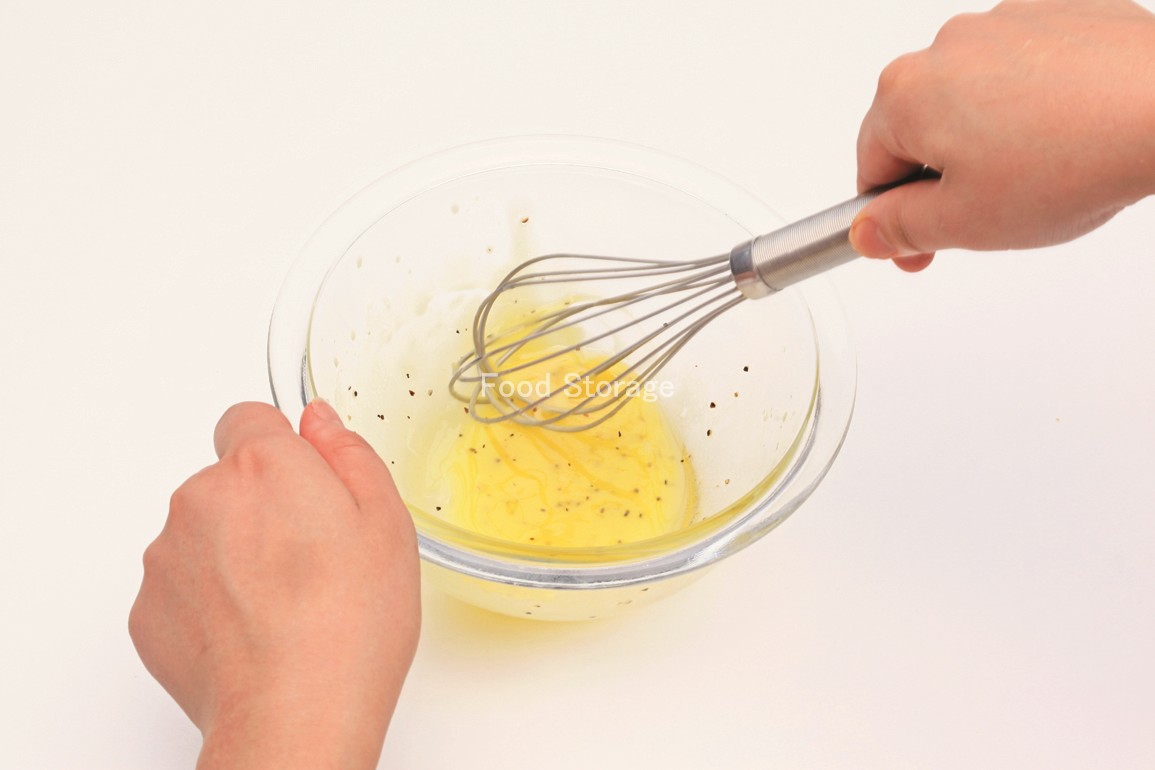 酢に塩、こしょうを混ぜてよく溶かしてから、サラダ油を少しずつ加えて混ぜ合わせると、よくなじむ。 |