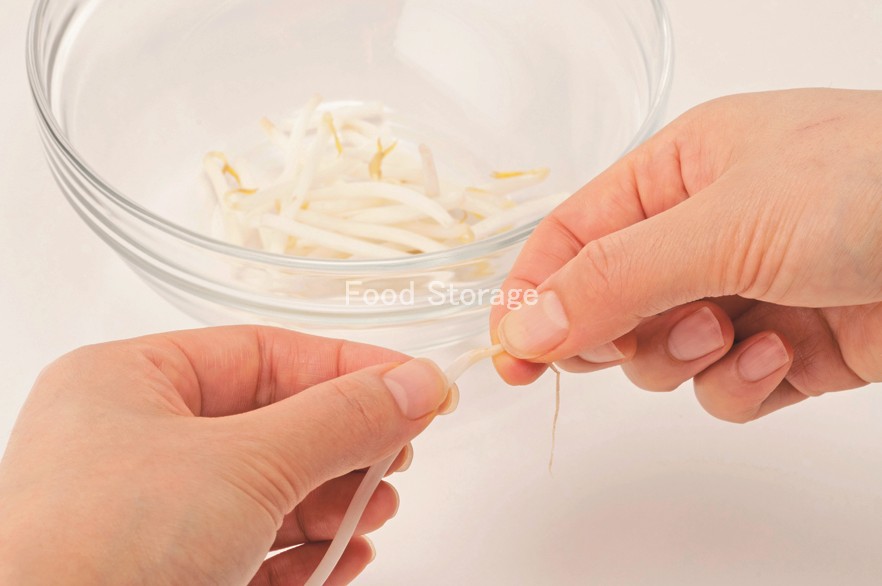 根が細くなる部分を手でつみ取るようにしてひげ根を取り除くと、口当たりがよくなる。