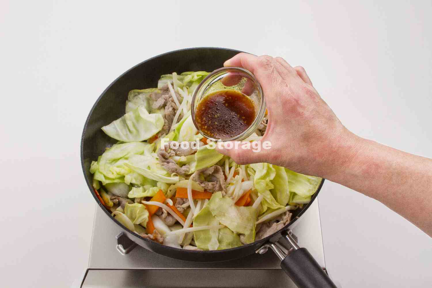 フライパンにサラダ油を熱して①を入れ、強火で炒める。肉の色が変わったら、にんじんとキャベツの芯を加えて炒め合わせる。 |