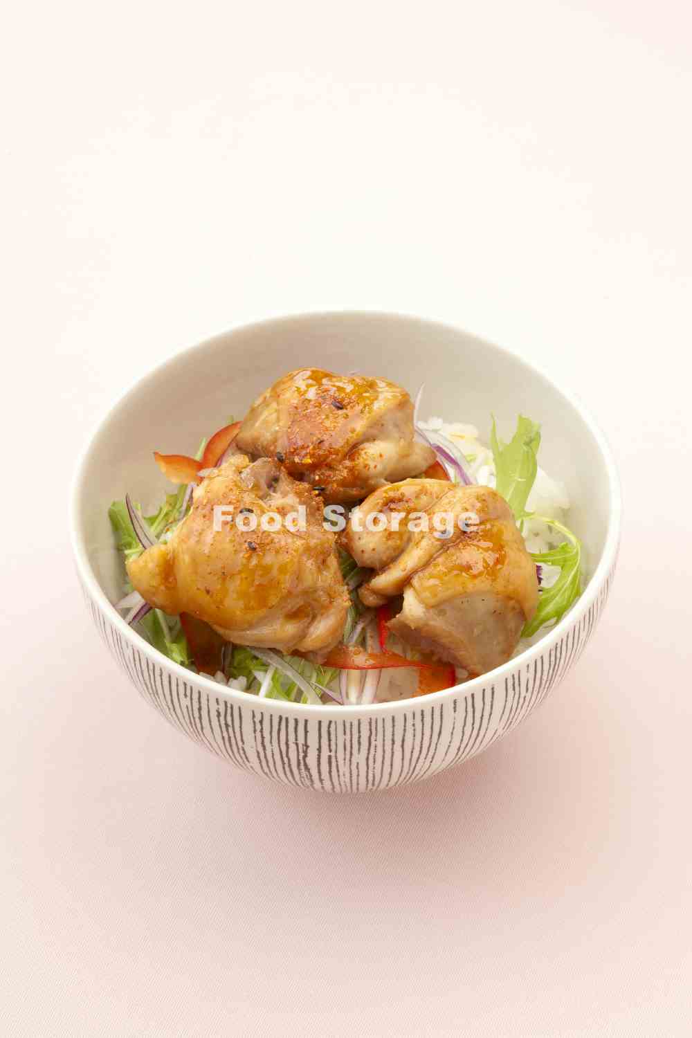 温かいごはんに水菜、パプリカ、紫玉ねぎをのせて「鶏肉のひと口照り焼き」をのせる。 |