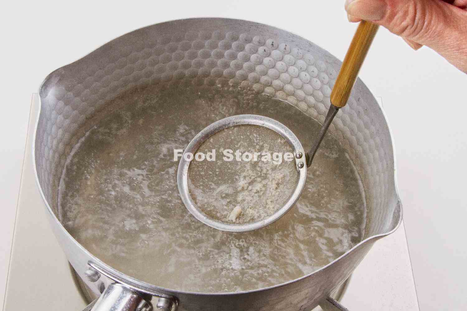 豚肉をゆでたうまみたっぷりのゆで汁は、あくを除いてスープに使う。