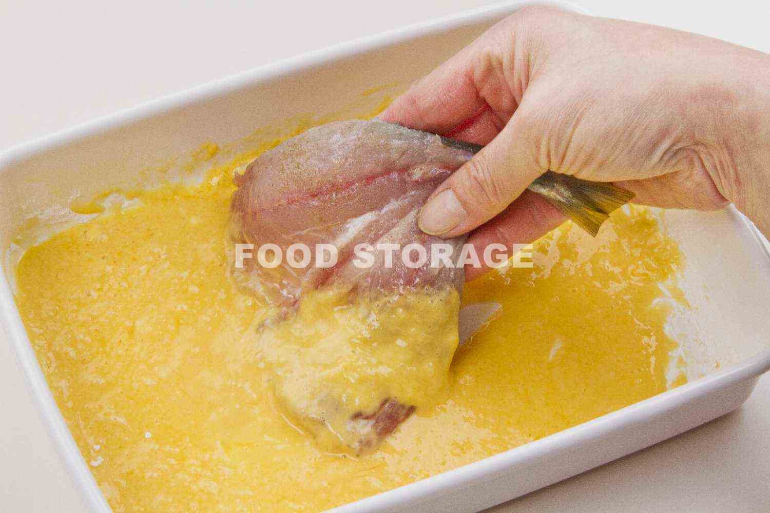 あじ(フライ用開き)は小麦粉、溶き卵を混ぜた衣にくぐらせ、パン粉、粉チーズバジルを混ぜたものをまぶして揚げる。 |