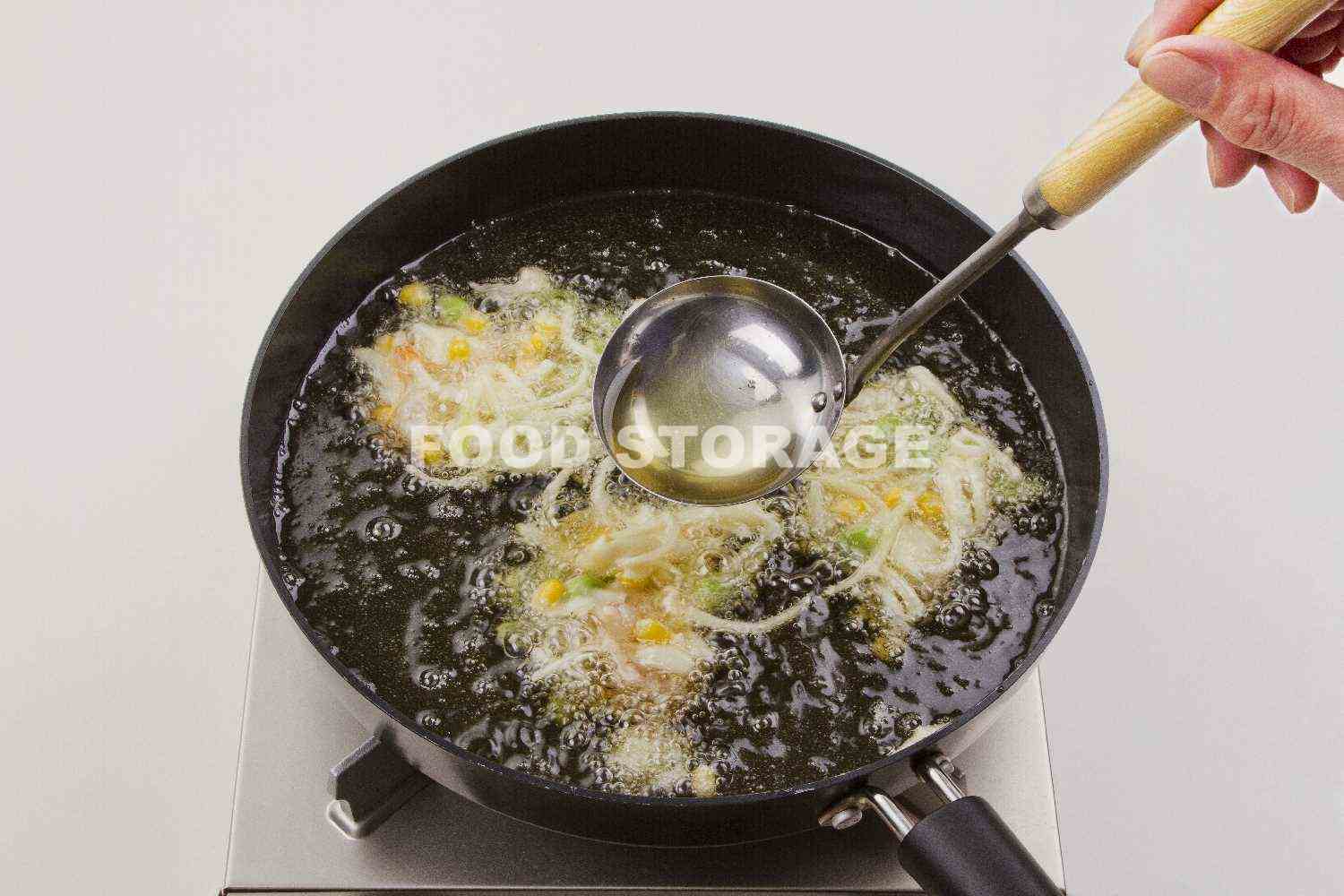 少な目の揚げ油にたねを入れ、上からおたまで油をかけながら揚げるとカラッと仕上がる。 |