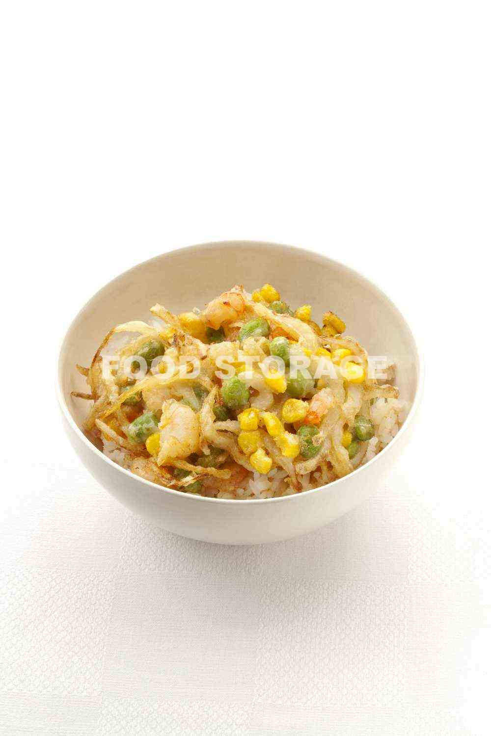 みりん、しょうゆ、砂糖を煮立てて「ひと口かき揚げ」を入れてひと煮し、温かいごはんにのせる。 |