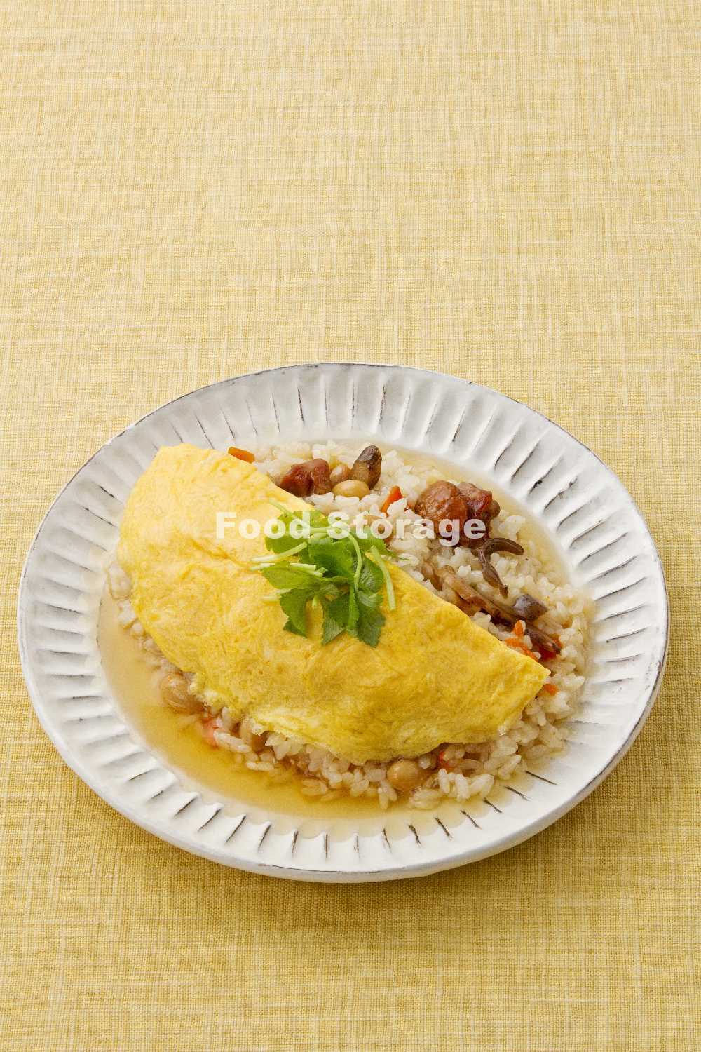 「五目炊き込みごはん」に薄焼き卵をのせ、だし汁、しょうゆ、酒、塩を煮立て、水溶き片栗粉でとろみをつけたあんをかける。 |