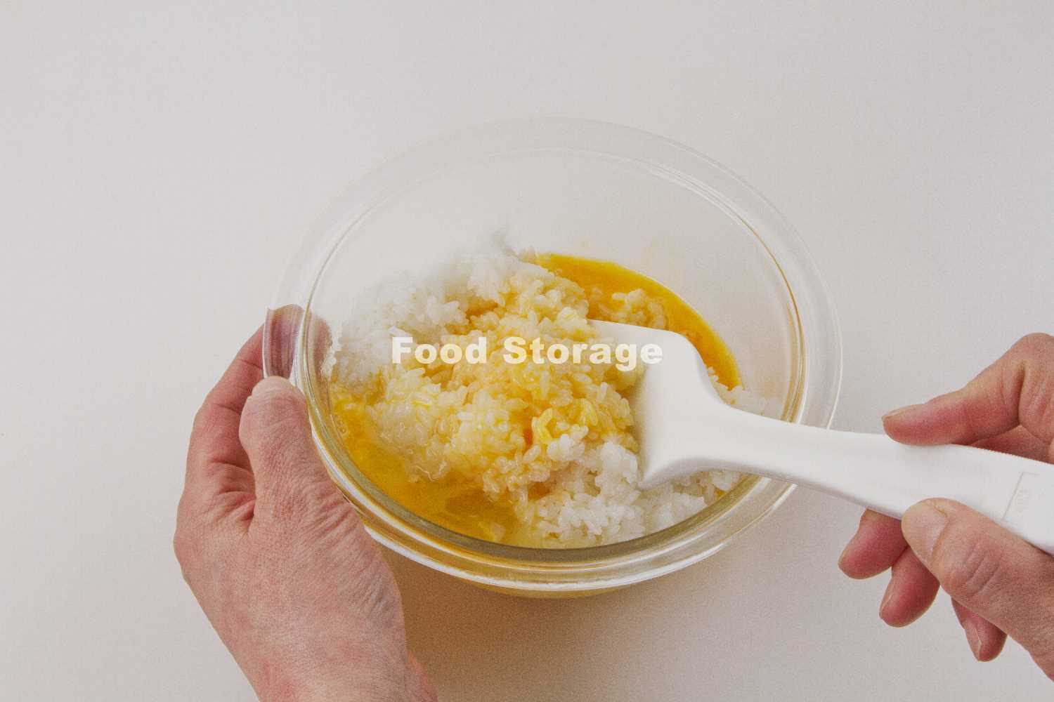 ボウルにごはんを入れ、溶き卵を加えて混ぜる。 |