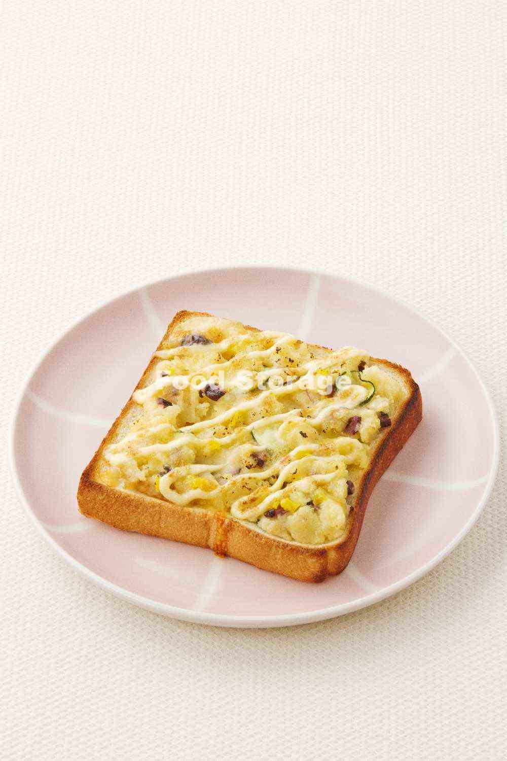 食パンに「和風ポテサラ」、ピザ用チーズをのせ、マヨネーズを細く絞りかけて、オーブントースターで焼く。 |