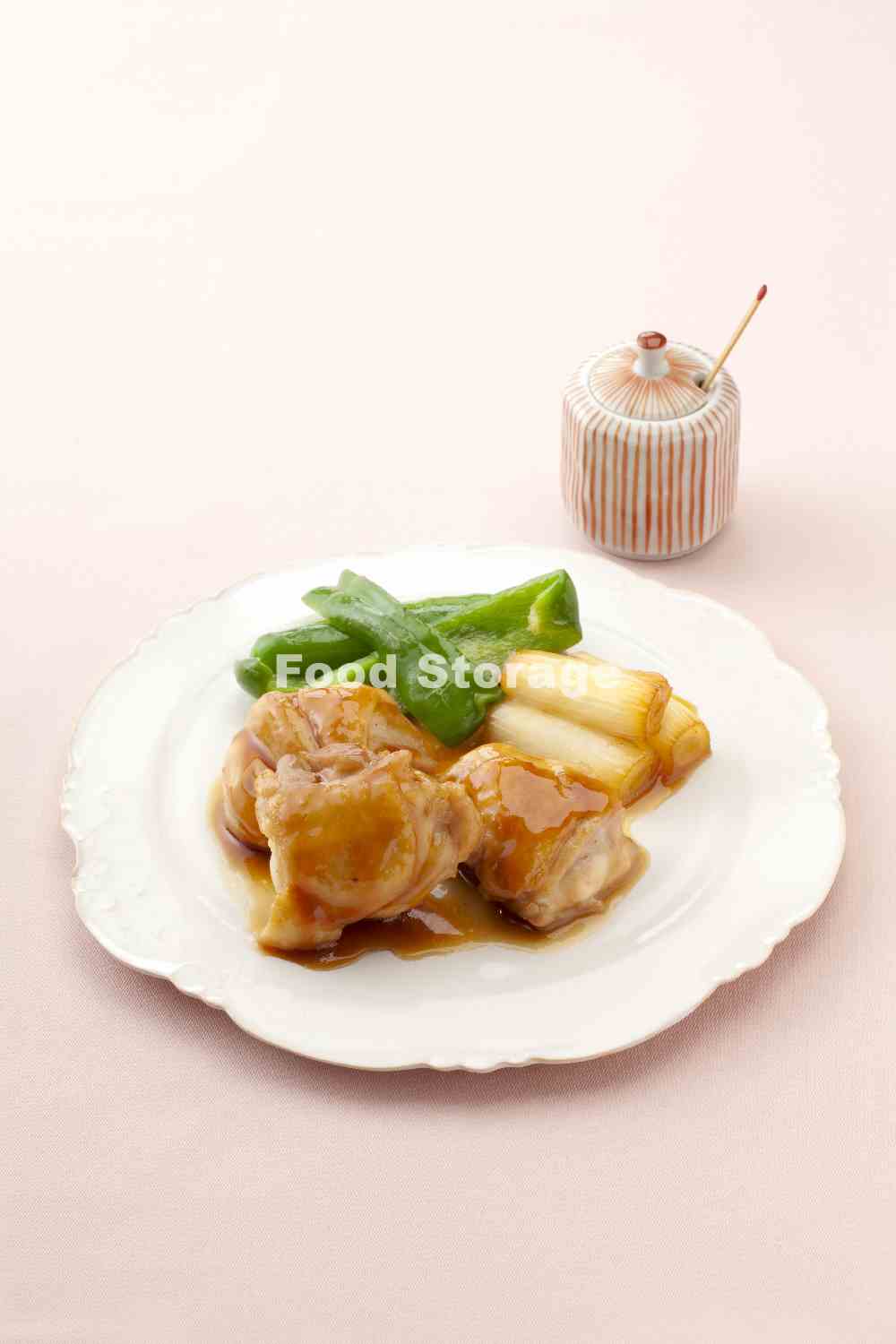 【5】④の鶏肉を器に盛り、長ねぎ、ピーマンを添え、フライパンに残ったたれをかける。七味唐辛子を添える。