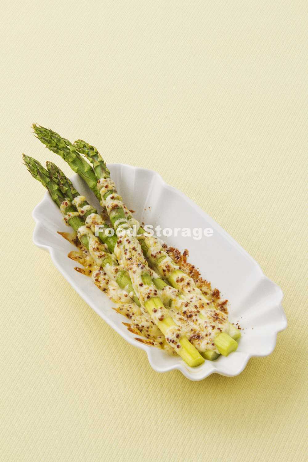 【1】アスパラガスはオーブン対応の耐熱皿にのせる。