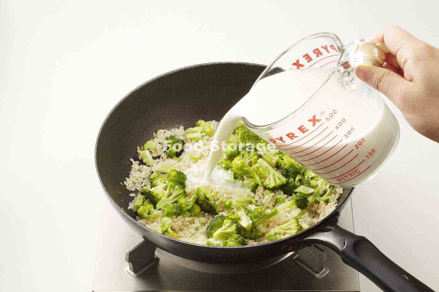 フライパンにオリーブ油を熱し、玉ねぎを加えてしんなりするまで炒める。米を洗わずに加えて透明になるまで炒め、ブロッコリーを加えてさらに炒め、塩、こしょうをふる。 |