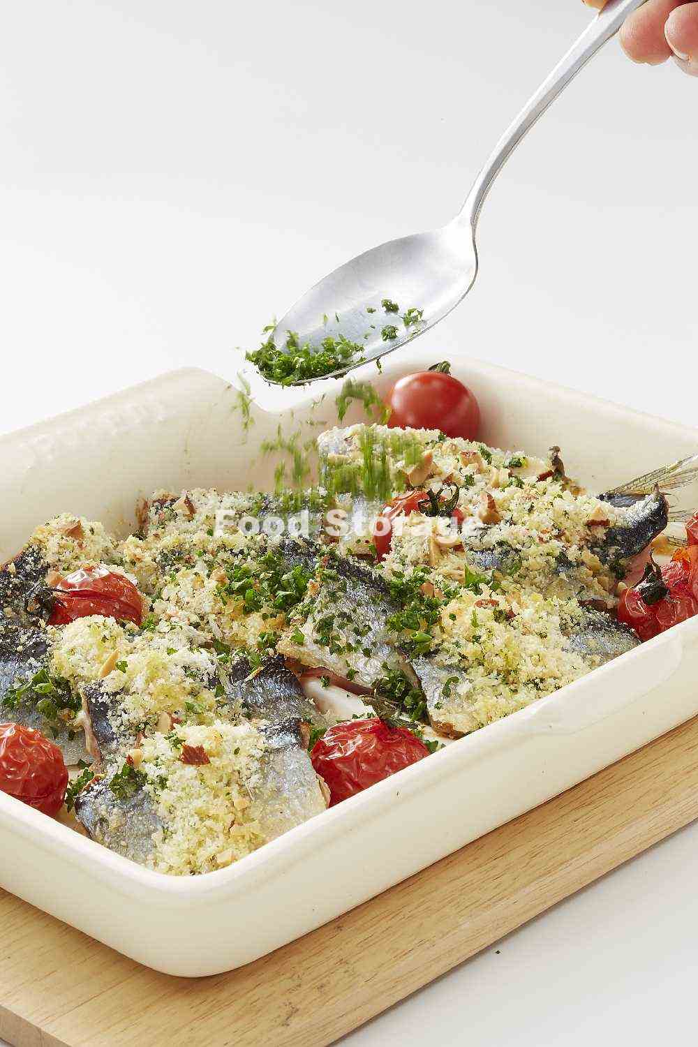 全体にオリーブ油を回しかけ、200℃に予熱したオーブンで15~20分焼き、パセリをふる。