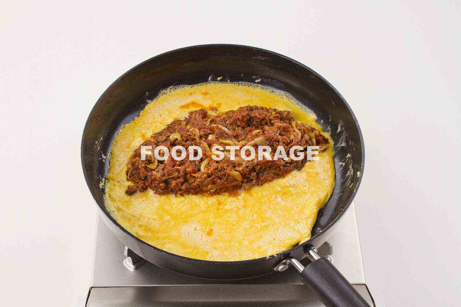 溶き卵にBを混ぜ、卵液を作る。きれいなフライパンにバターを中火で熱し、卵液を流し入れる。へらで大きくかき混ぜ、半熟状になったら丸く広げ、②を奥側半分にのせる。 |