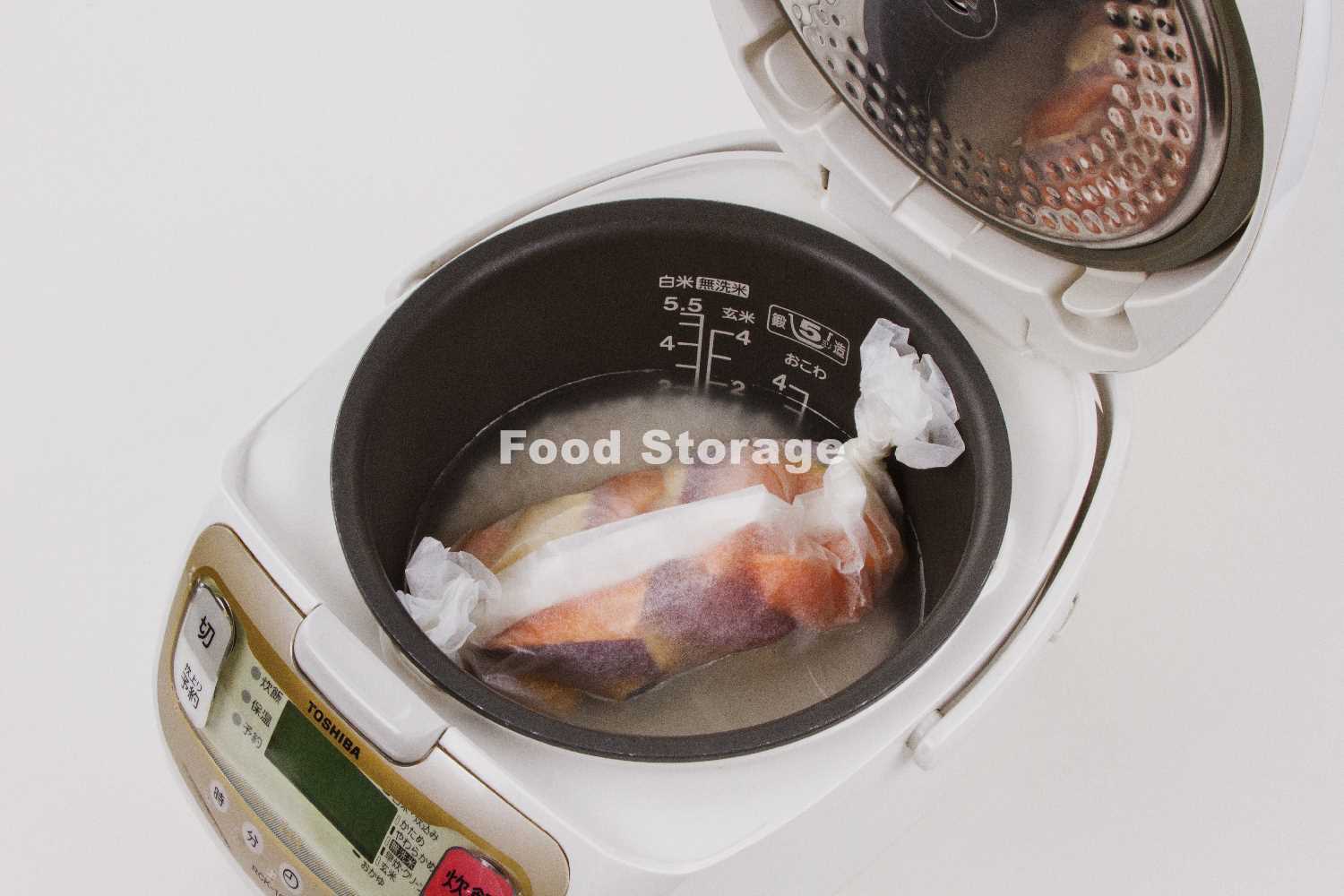 ごはんを炊くとき、炊飯器に副菜のかぼちゃ、さつまいも、にんじんをいっしょに入れて、同時加熱。 |