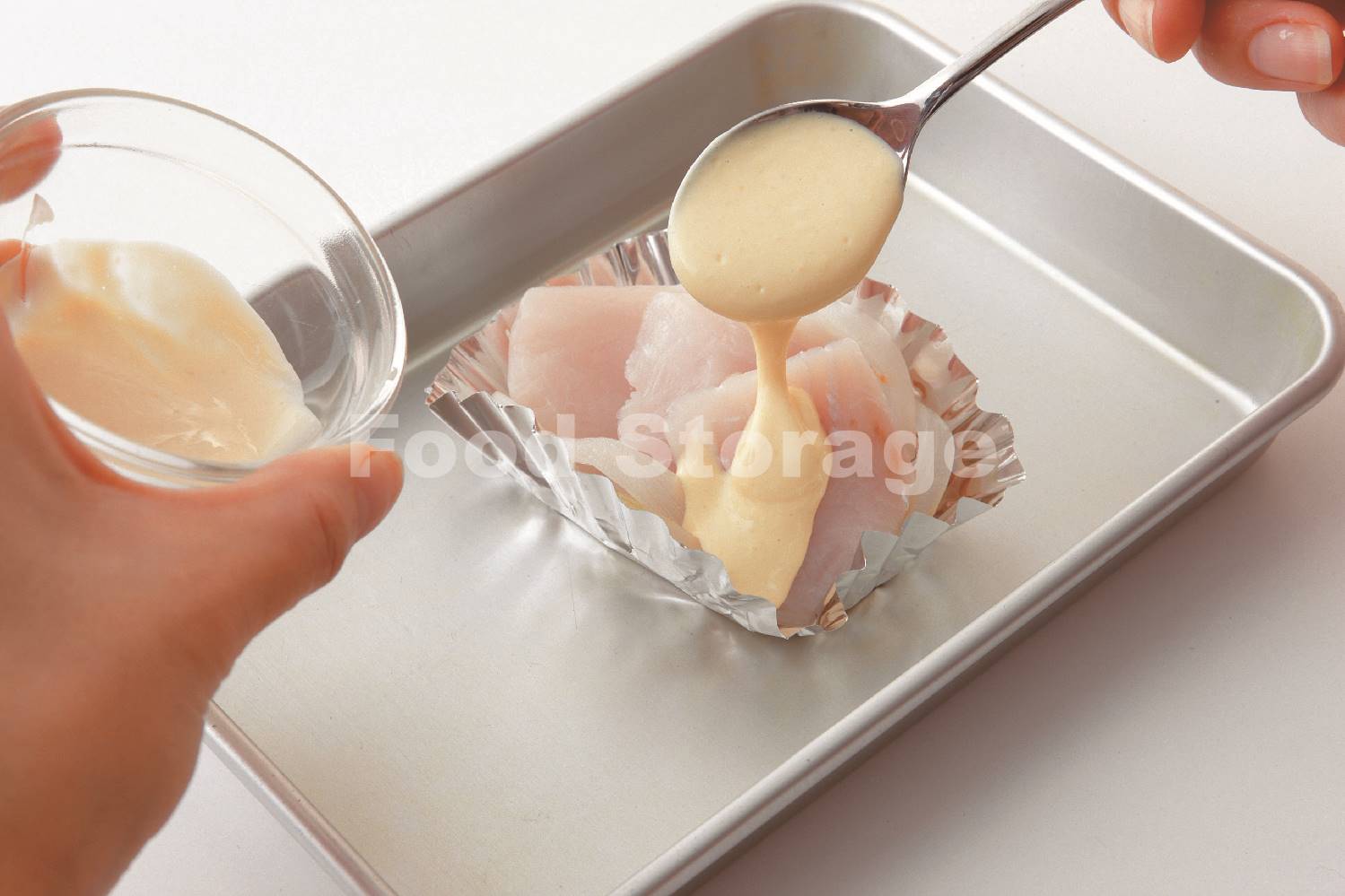 (2)ボウルにAを合わせて、1をあえる。 |