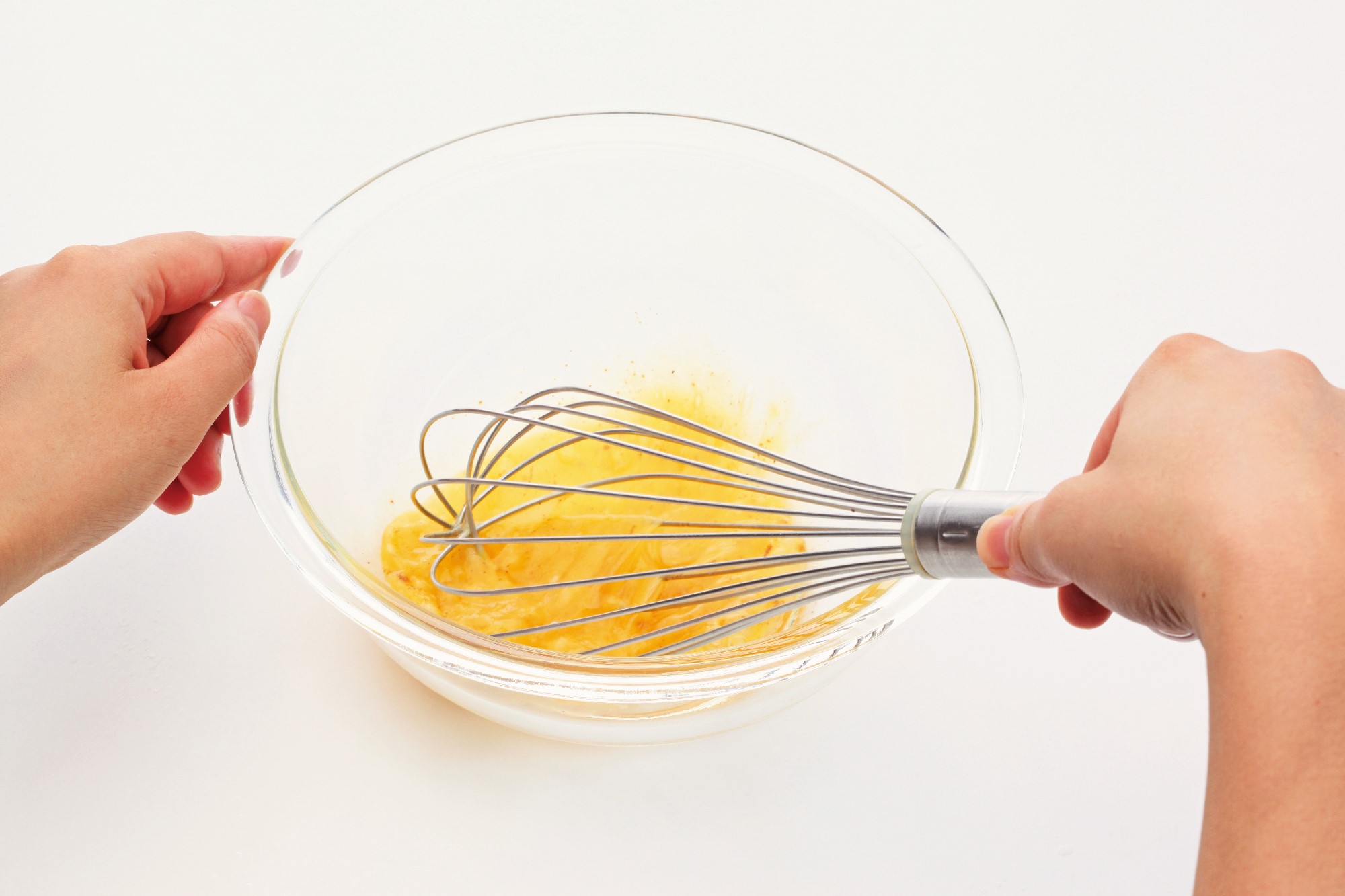 ボウルにナツメグ、塩、こしょう、酒、卵の順に入れ、泡だて器でよく混ぜる。 |
