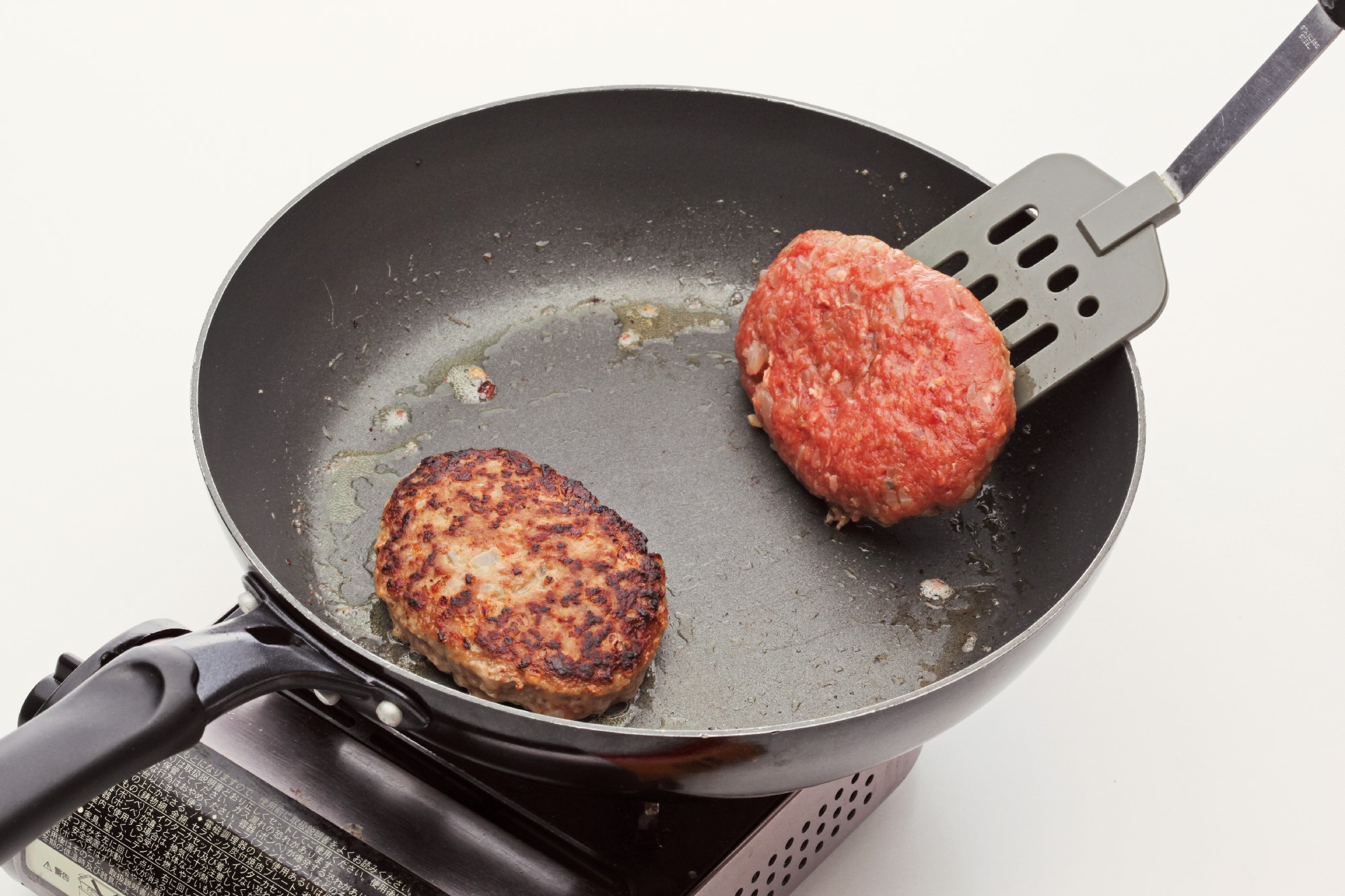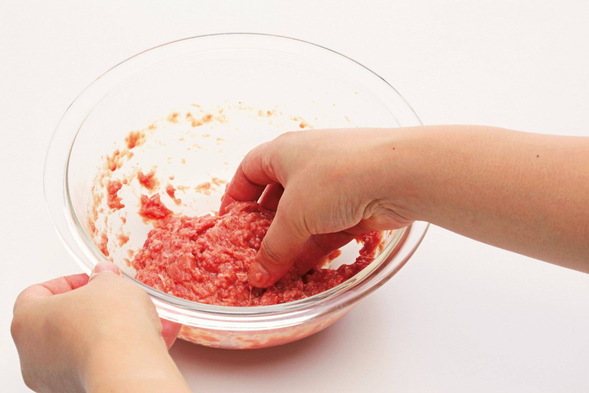 ③に合いびき肉を加え、粘りが出るまでよく練り混ぜ、②、パン粉を加えてさらに混ぜる。 |