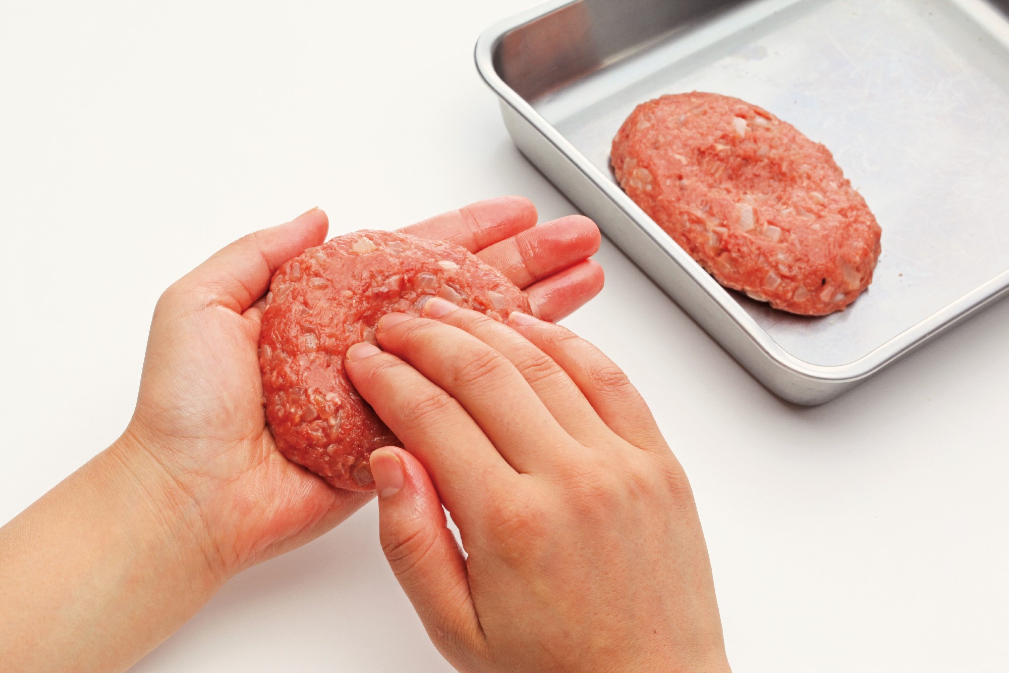 ④の半量を丸め、両手でキャッチボールをするようにして肉の中の空気を抜く。小判形に形を整え、表面をなめらかにし、中央を少しくぼませる。同様にもう1個作る。 |