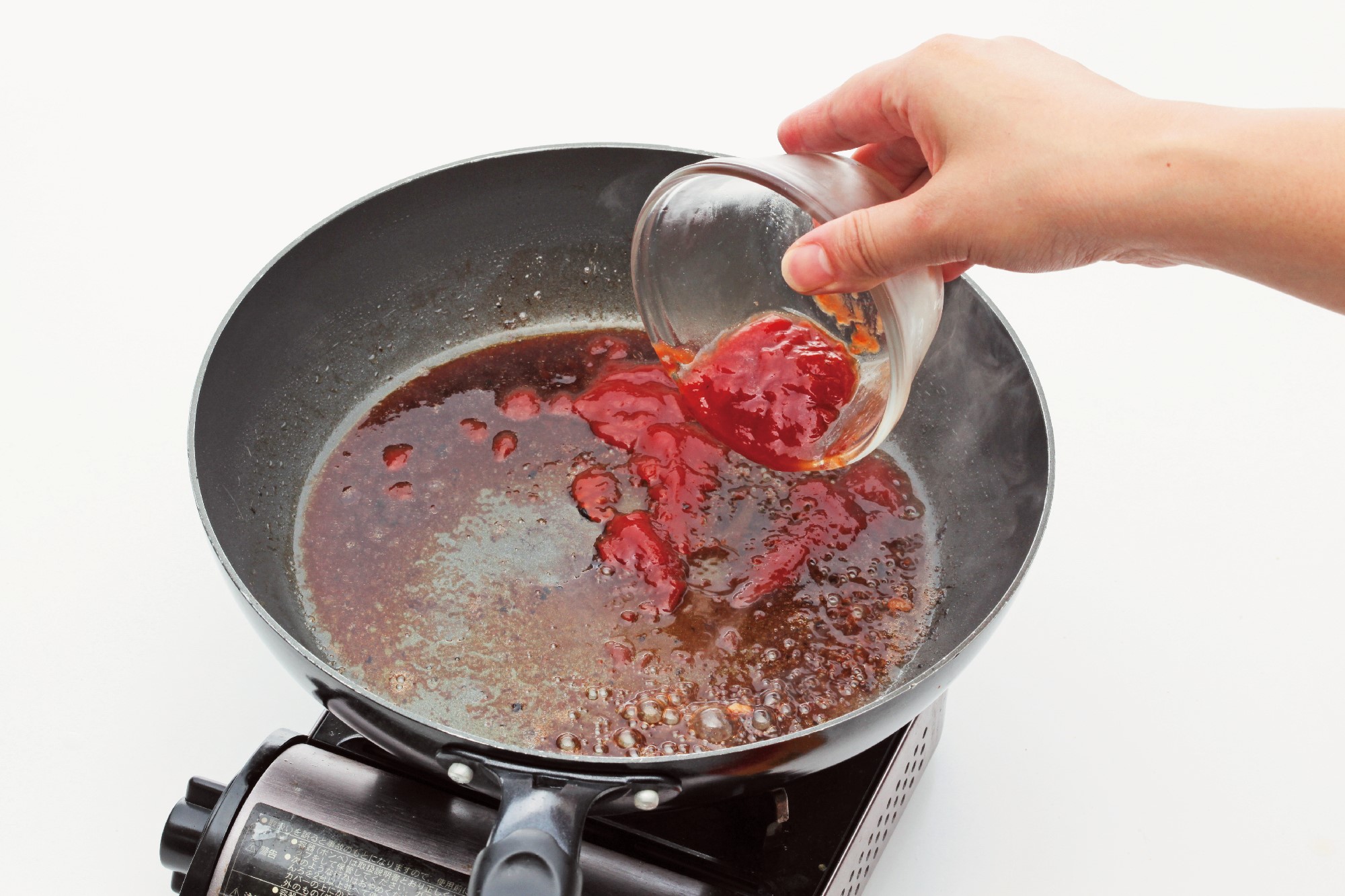 ⑥のフライパンにAを加えて中火で煮詰め、⑥にかける。 |