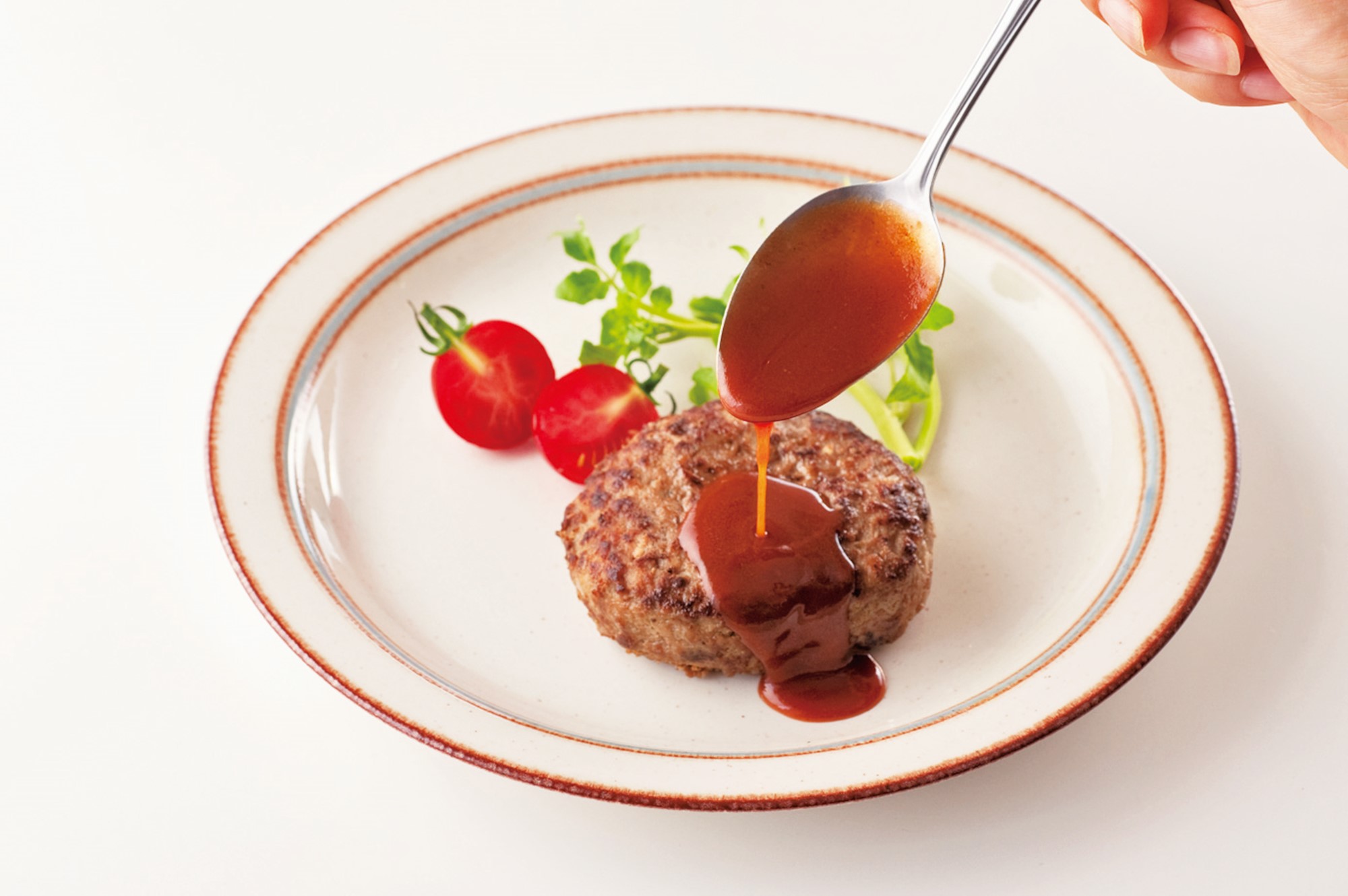 ハンバーグを真ん中に盛り、ソースはハンバーグの中心から手前に向かってお皿にたれるようにかける。 |