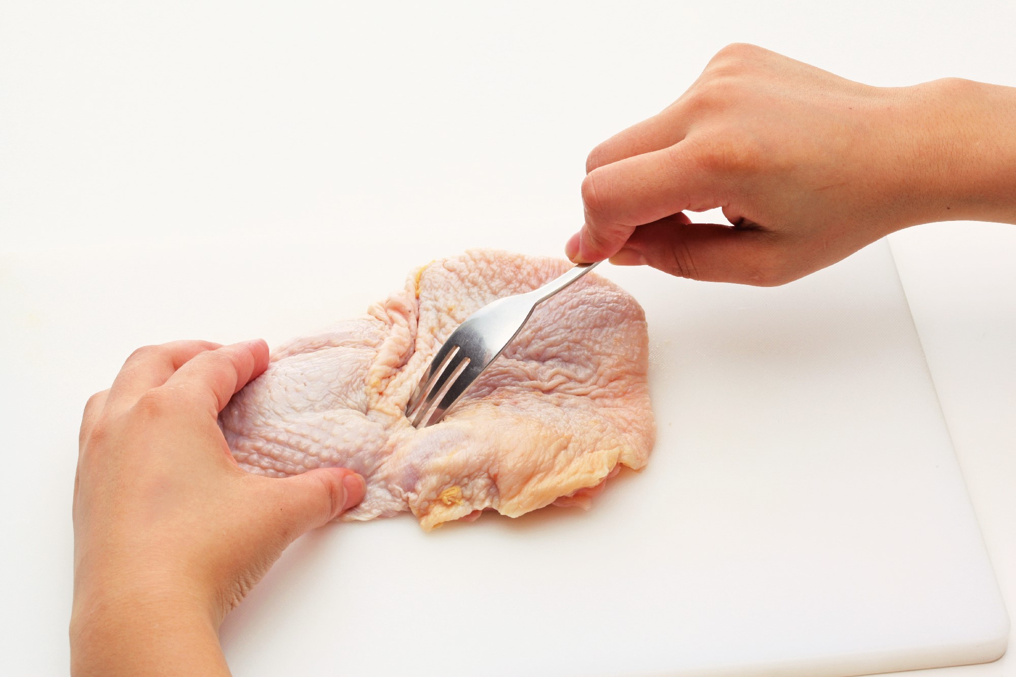 鶏もも肉の皮目にフォークで穴をあけ、ひと口大に切って塩、こしょうをふり、プレーンヨーグルトに20分ほど漬ける。 |