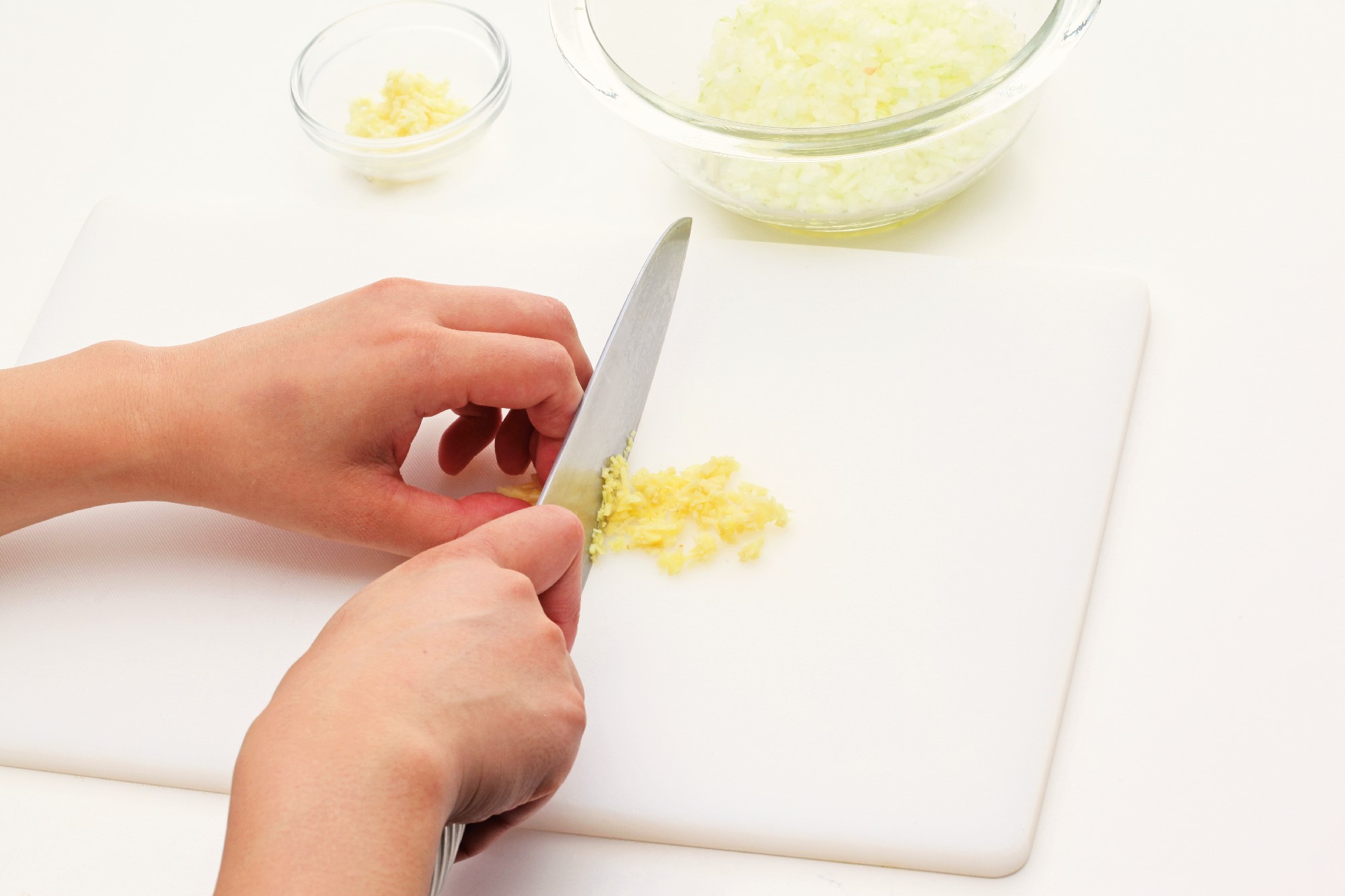 玉ねぎ、にんいく、しょうがをそれぞれみじん切りにする。