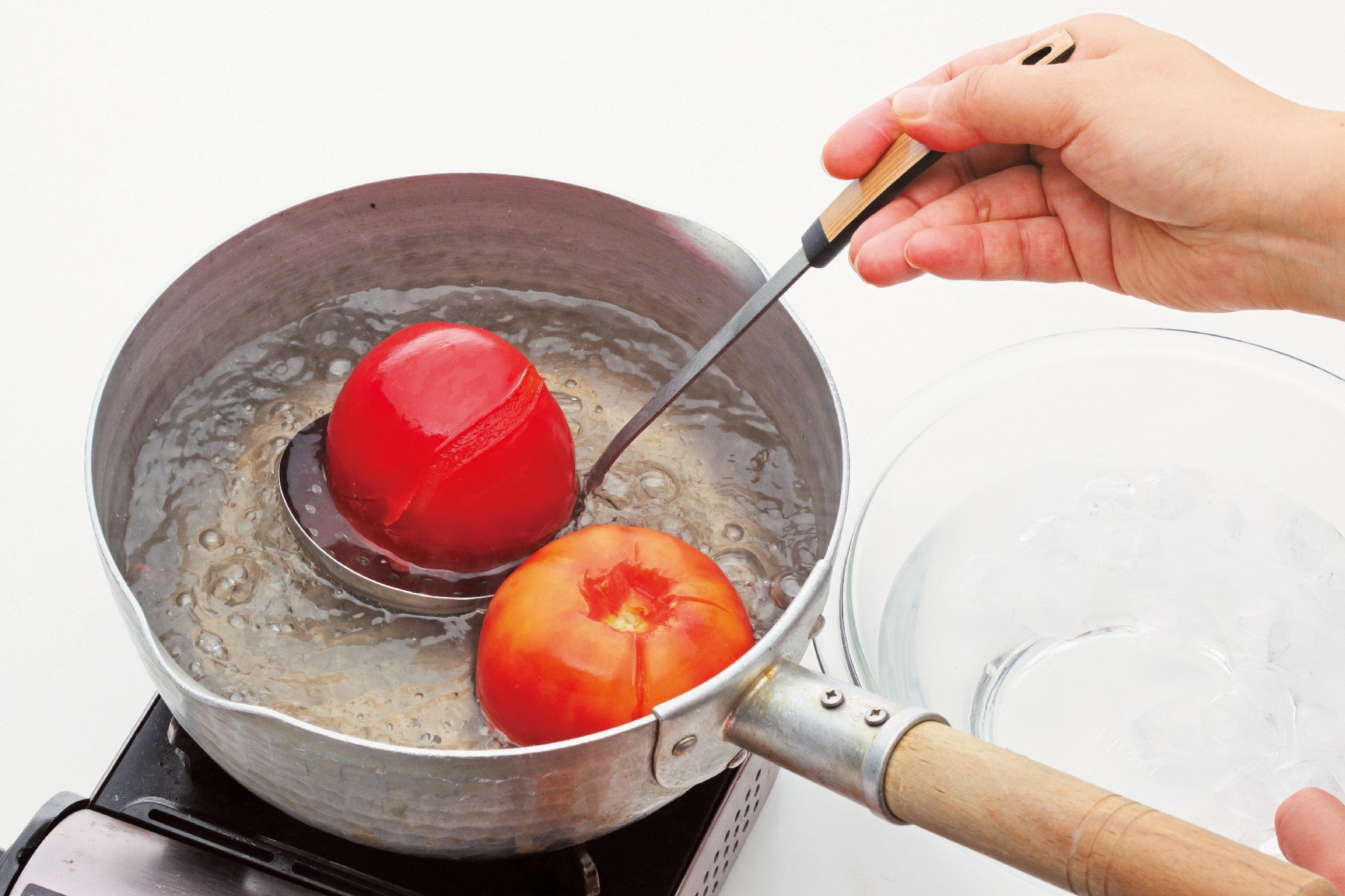 鍋に熱湯を沸かし、③を入れて皮がめくれてきたら冷水にとって、皮をむく。