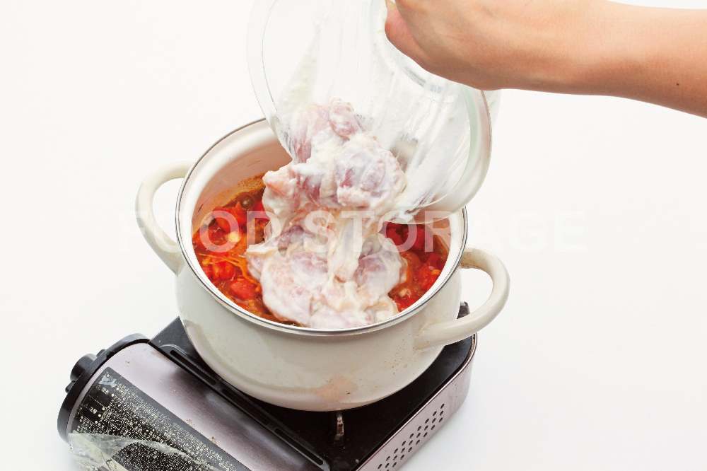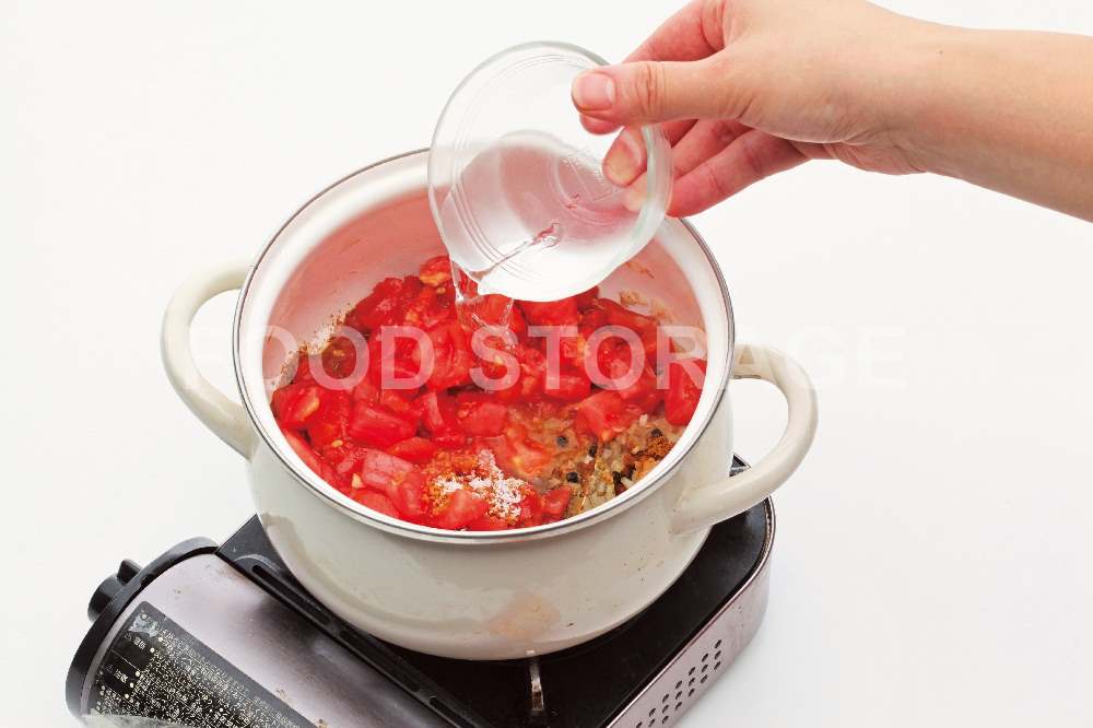 Point:トマトは煮込むと溶けるので、ざっくり切ってOK。 |