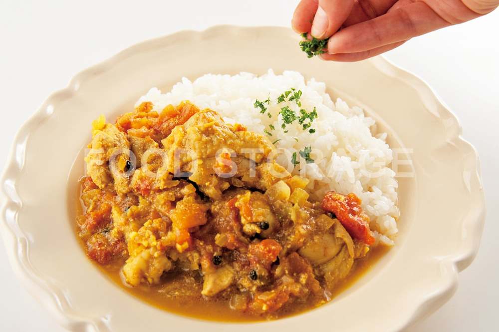 ⑦に①をヨーグルトごとすべて加え、ふたをして弱火で煮る。器にごはんをもってカレーをかけ、みじん切りにしたパセリをふる。